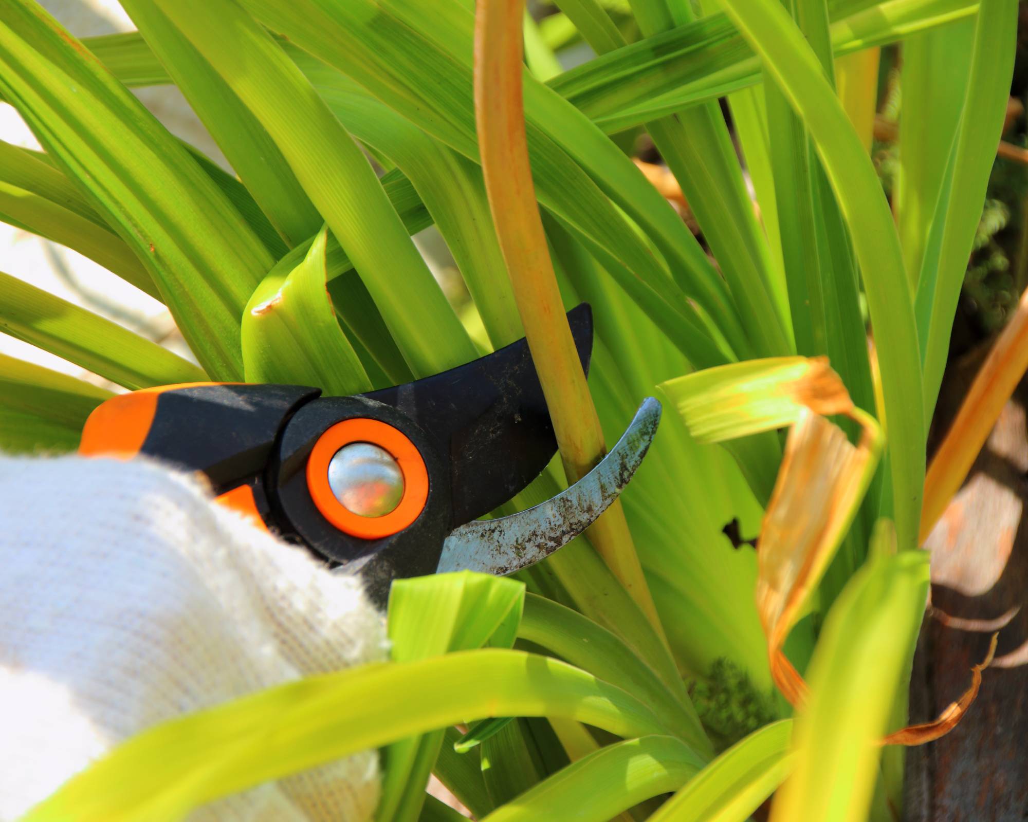 Empieza a podar las azucenas con unas buenas tijeras de podar, como estas tijeras de podar Fiskars que se pueden encontrar en Amazon. Empieza por los tallos de las flores marchitas. Córtalos a unos 2,5 cm de la corona. Las hojas amarillas o marrones se pueden arrancar o cortar limpiamente.