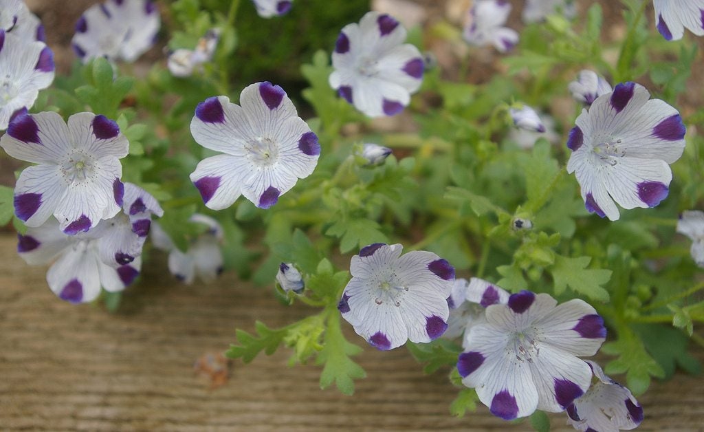 Rara vez superan los 20,5 cm de altura, las cinco manchas son ideales para los bordes de las macetas. El nombre de su género, Nemophila, significa «amante de la sombra», lo que hace que estas bonitas flores sean perfectas en situaciones de poca luz. También crecen bien en zonas con luz solar brillante pero indirecta. Combinar otras plantas autóctonas con nemofilas en maceta facilita el cuidado y fomenta la flora local. Las nemofilas en maceta tienen delicadas flores de 2,5 cm y un follaje delicado. Las plantas son endémicas de California y crecen mejor a temperaturas de entre 15 y 21 °C. En regiones cálidas, deben cultivarse en sombra parcial. Esta planta de bajo crecimiento funciona perfectamente como cubierta vegetal o planta de borde. Incluso cuelga de forma encantadora en cestas colgantes. Estas plantas se desarrollan mejor en suelos húmedos con abundante abono. Siembre cinco semillas directamente en una maceta o comience en interior seis semanas antes de la última helada prevista.Cómo cultivar Baby Blue Eyes en una maceta