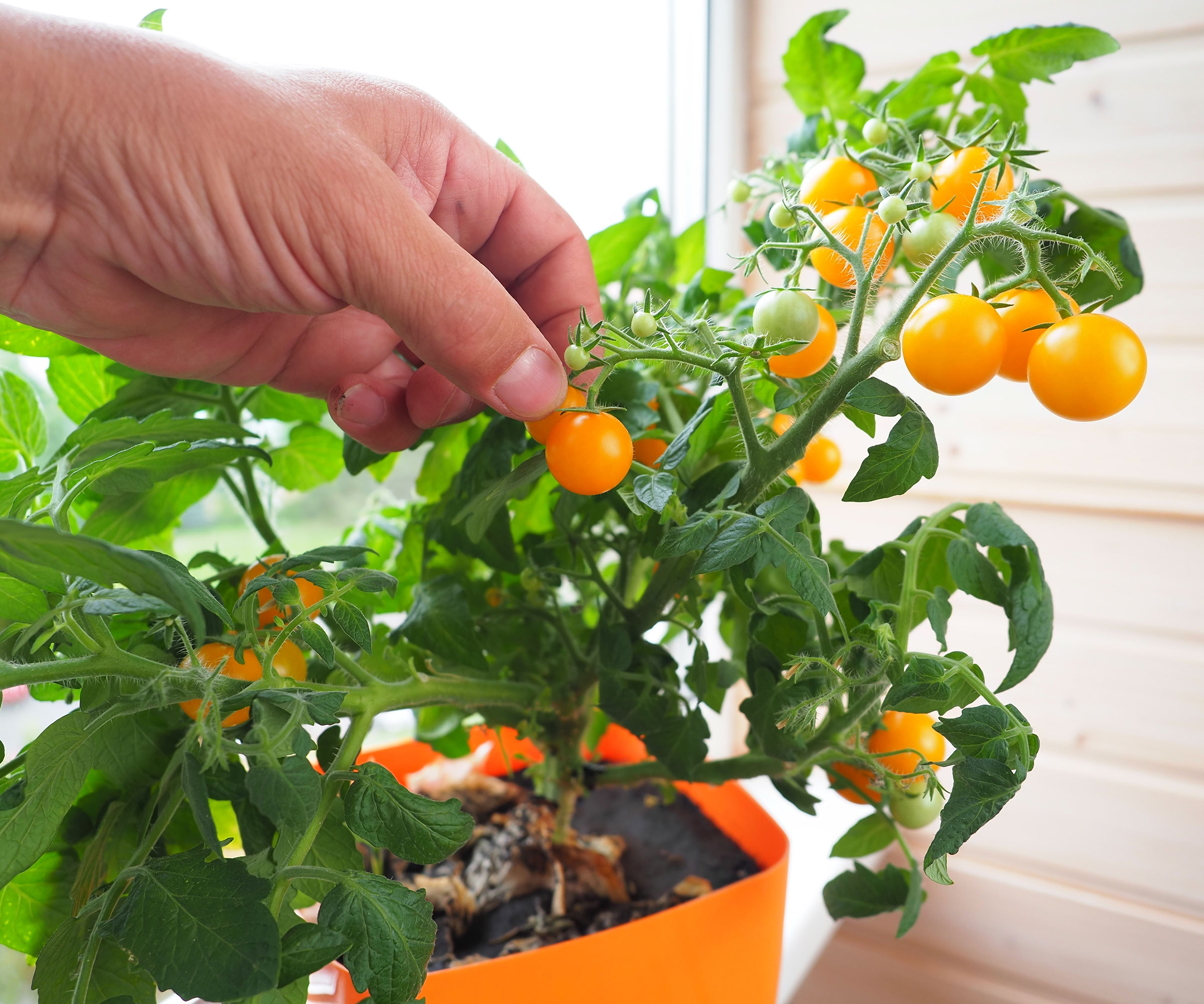 Puede conservar los tomates de verano llevando las plantas «de exterior» al interior al final del verano para que sobrevivan durante el invierno. Las plantas más viejas dejarán de producir gradualmente, por lo que no podrá conservarlas para siempre, pero al menos es posible prolongar la cosecha. Sin embargo, también puede cosechar tomates de interior durante todo el año. Simplemente cultiva las variedades adecuadas en lotes sucesivos, sembrando nuevas semillas cada dos semanas.
