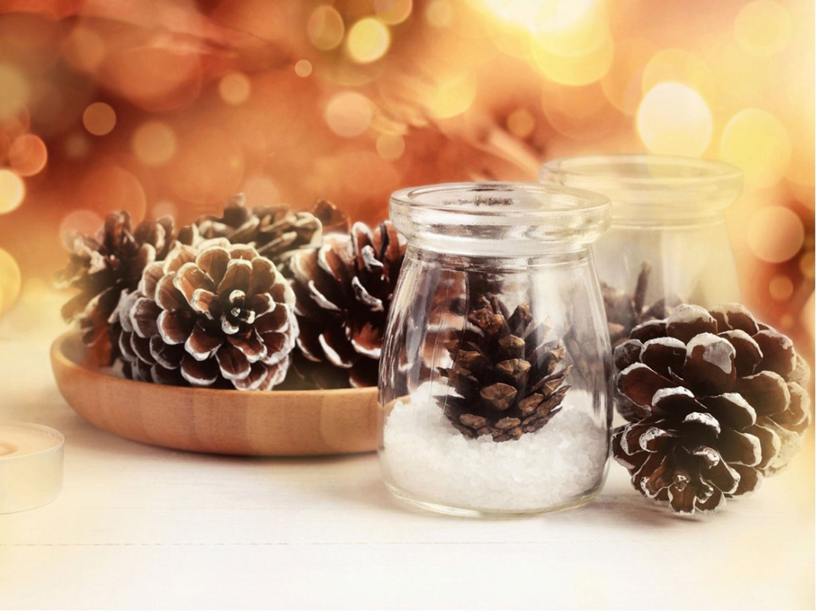 - Decora tarros de conserva con cinta, piñas pequeñas y ramas de pino. Inserta velas LED para crear un portavelas sin llama.