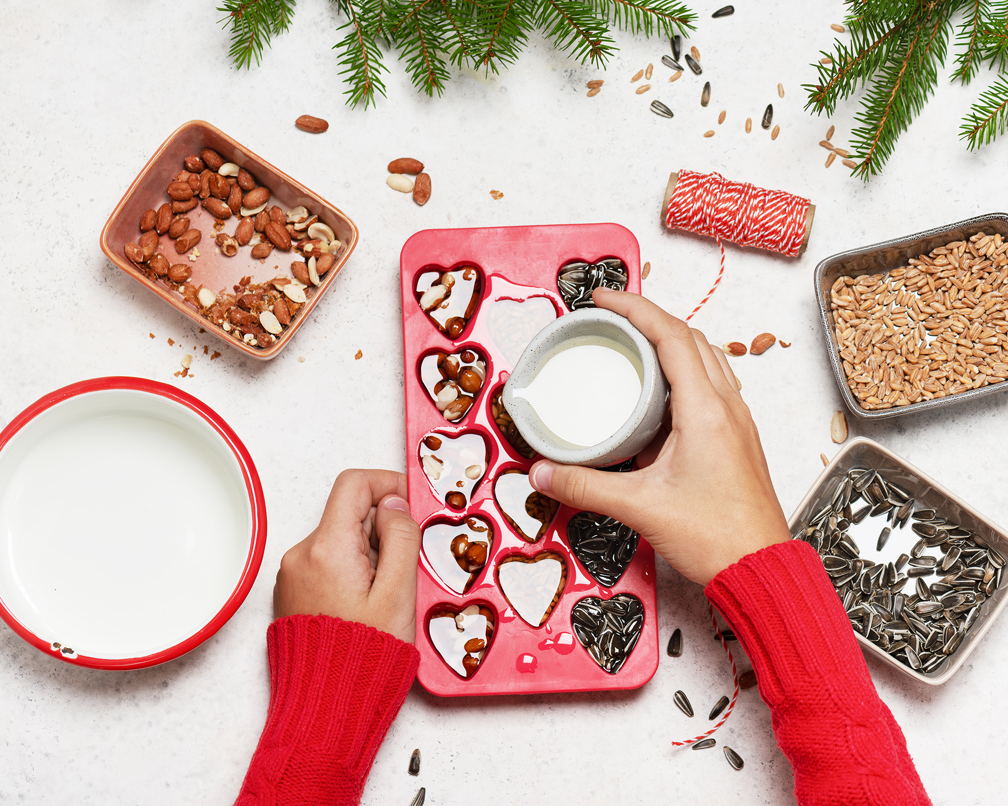 - Grasa– La manteca pura (grasa de vacuno) es la opción clásica, ya que se solidifica con el frío y sujeta bien las semillas. La manteca vegetal es una buena alternativa.