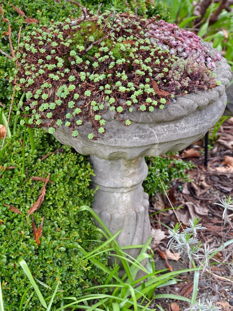 Hay muchas formas de plantar dentro del bebedero para pájaros. Las suculentas son una gran opción, ya que la mayoría tienen raíces poco profundas y el espacio del bebedero probablemente no sea demasiado profundo. Alterna los colores de las plantas y utiliza algunas que caigan en cascada.
