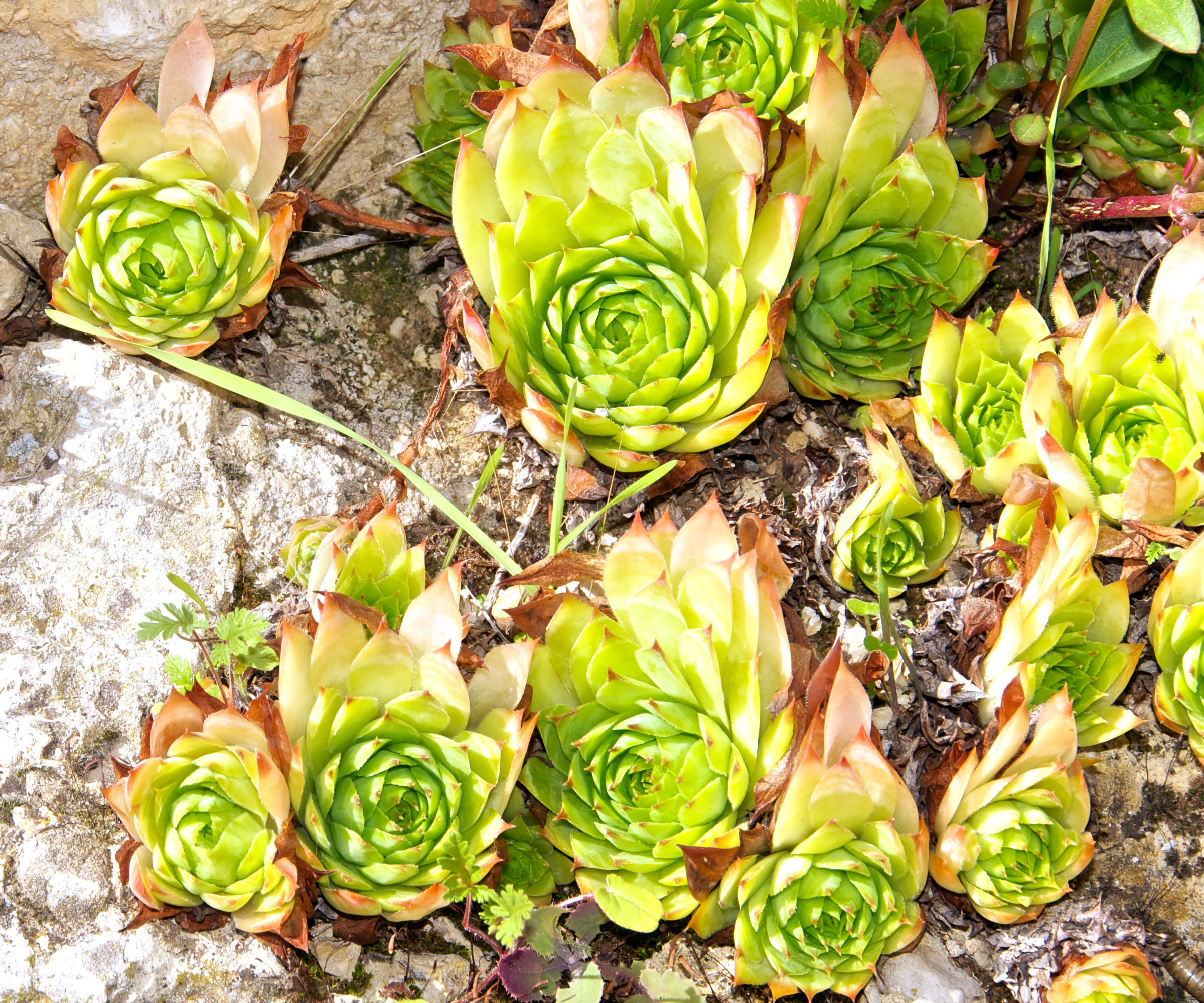 ¿Vives en una zona con inviernos fríos? Si es así, esta suculenta que forma una alfombra con sus rosetas carnosas es ideal para ti. Es una de las más resistentes del grupo y puede sobrevivir hasta la zona 3 del USDA. Las gallinas y los pollitos (Sempervivum tectorum) crean rápidamente una alfombra de atractivas hojas puntiagudas. Las grandes son las gallinas y las pequeñas ramificaciones son los polluelos. Son capaces de adquirir colores magníficos dependiendo de la región y la exposición al sol, desde el púrpura intenso hasta el magenta y el dorado brillante.
