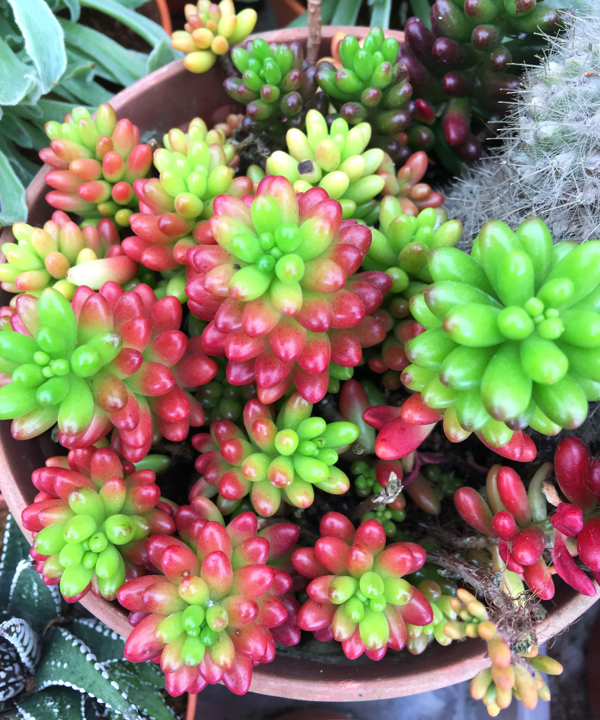 Esta bonita planta es originaria de México. Sus hojas regordetas tienen la parte superior de un color rojo rosáceo brillante que se asemeja al de las gominolas. Tome un esqueje, déjelo secar durante unos días, plántelo y observe cómo crece. La planta de gominola (Sedum rubrotinctum) puede extenderse un poco, pero nunca superará la altura de tus rodillas. Otra suculenta para zonas cálidas, queda especialmente bonita colgando de una cesta y puede producir flores en forma de estrella en primavera.
