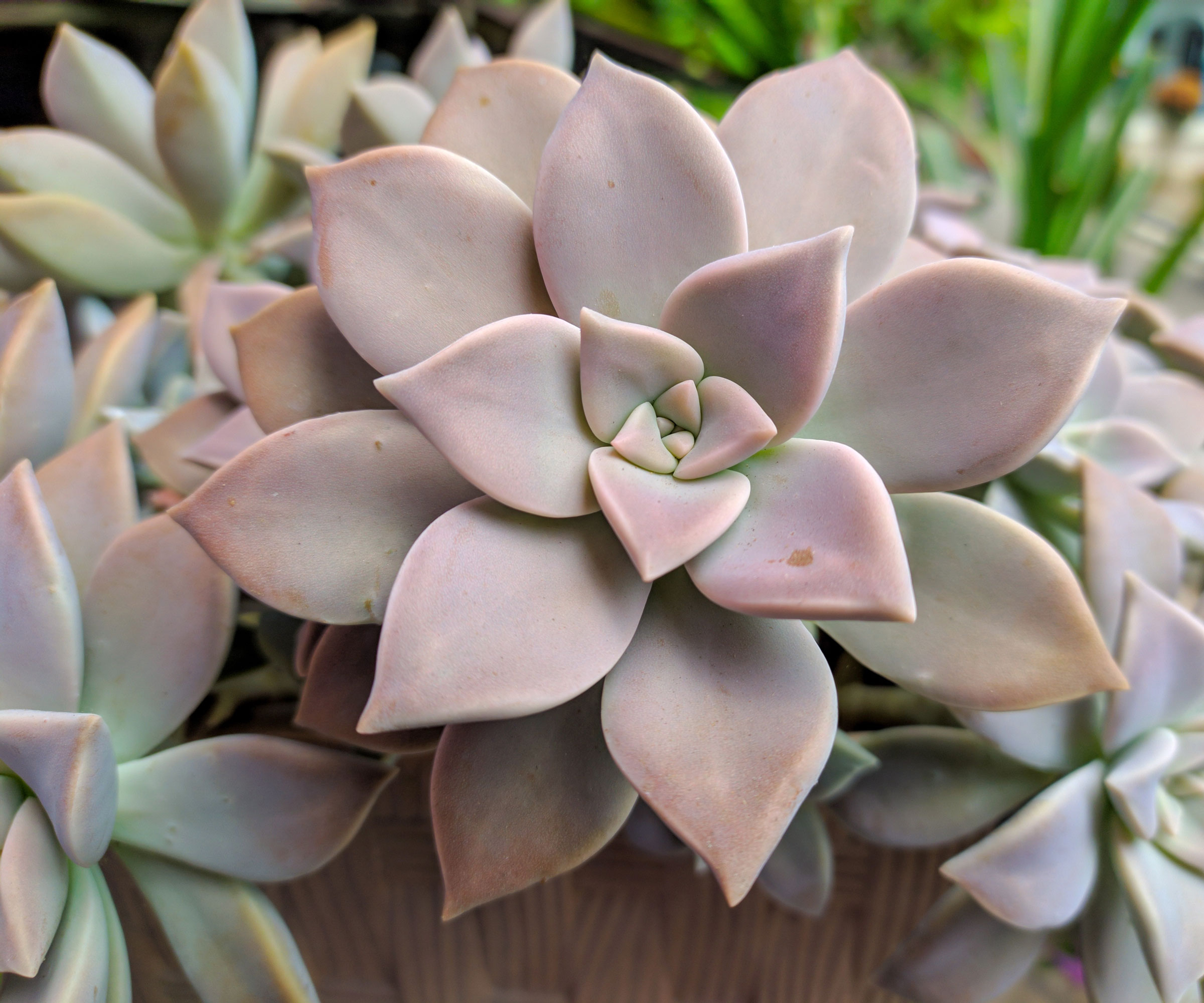 Esta pequeña suculenta erguida recibe su nombre común por el color de sus hojas puntiagudas. La planta fantasma (Graptopetalum paraguayense) crece en rosetas del tamaño de la palma de la mano y puede adquirir un color ligeramente azulado si se cultiva a la sombra, o amarillento si se cultiva al sol. Cultívala en macetas para mostrar estas formas de rosetas colgantes. Esta planta crece hasta 30 cm de altura y 1 m de ancho en zonas cálidas.