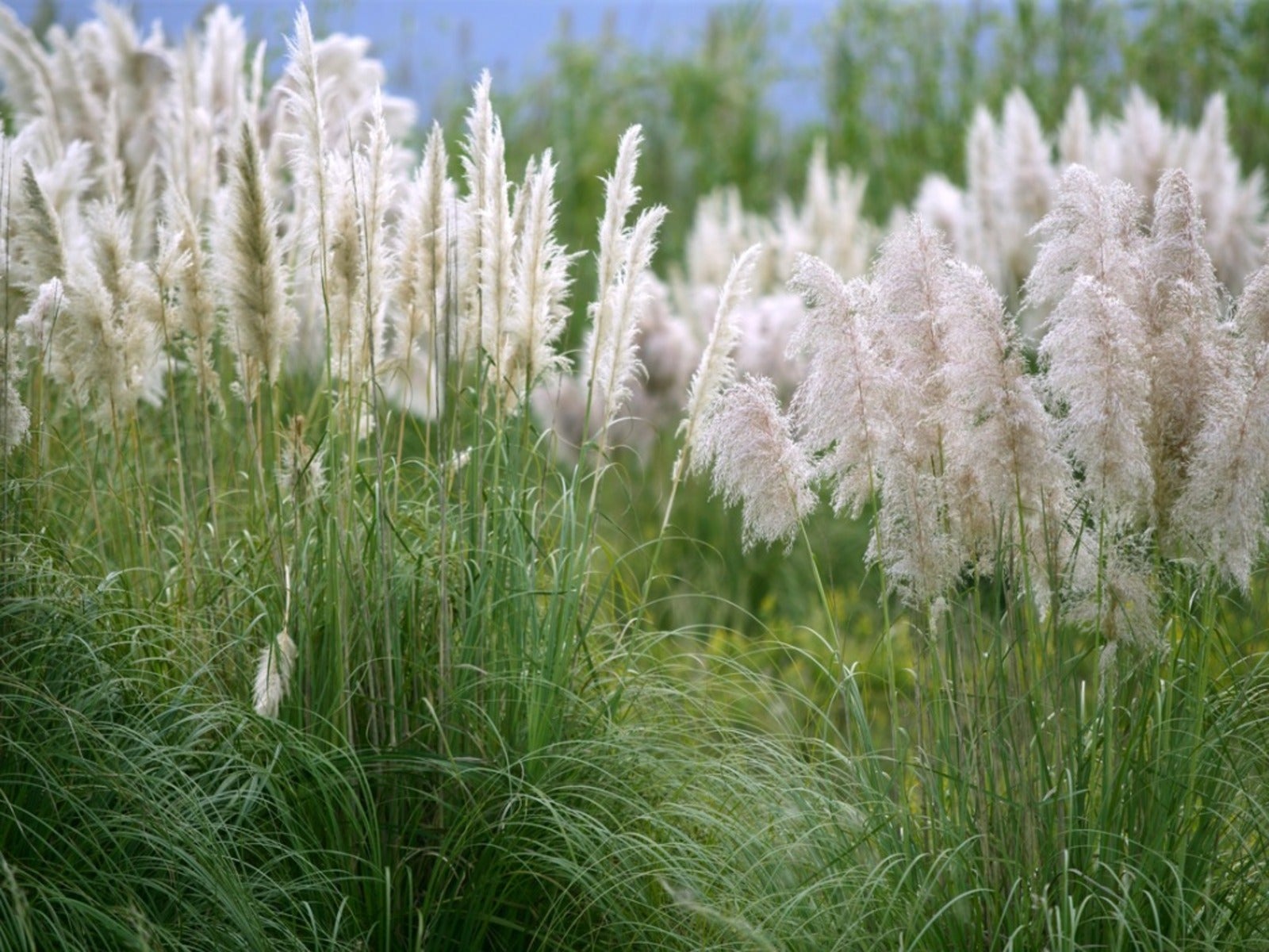 Una de las hierbas ornamentales más populares es la hierba de la pampa (Cortaderia selloana). La hierba de la pampa establecida es un espectáculo digno de contemplar: matas individuales que pueden alcanzar alturas de unos 4 metros, adornadas con plumas blancas.