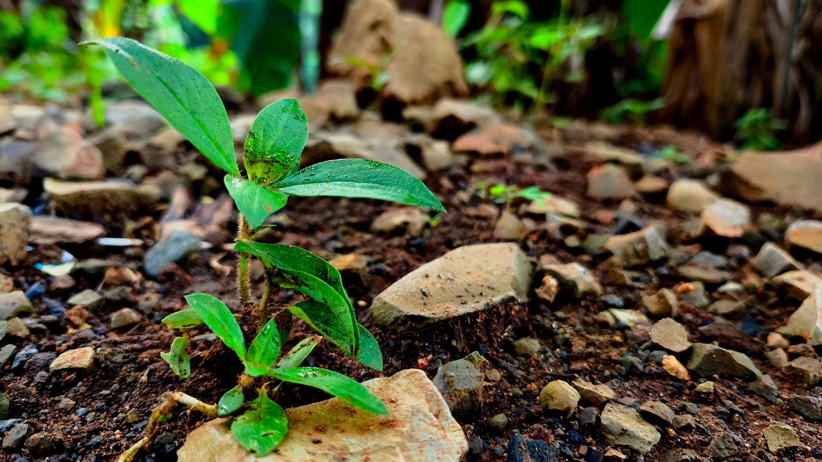 Una vez que tenemos controlado el estado de la tierra, ¿qué hacemos? En invierno sufrimos heladas intensas y en verano vientos fuertes, y aquí fuera hay un montón de malas hierbas. Las rocas que dejé en su sitio pueden atrapar semillas de malas hierbas que, de alguna manera, pueden brotar y crecer entre ellas. Por eso sabía que lo que necesitaba urgentemente era eliminar las malas hierbas y añadir algún tipo de cubierta vegetal eficaz.