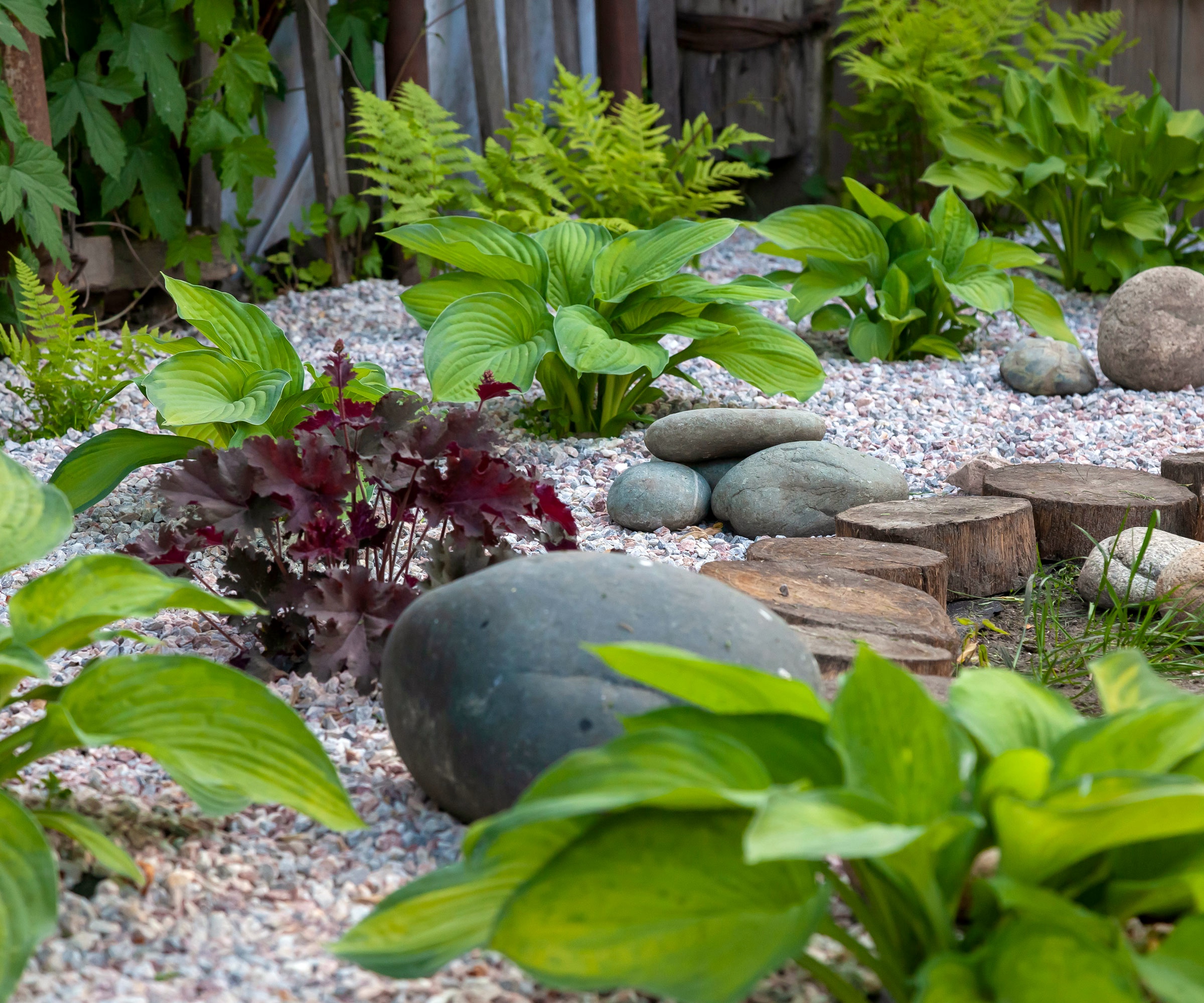 Mi siguiente tarea fue integrar algunas plantas ornamentales que tenía desde hacía tiempo. Tenía una zona sombreada y quería dar rienda suelta a mi pasión por las hostas. Tuve que mover más rocas, pero mereció la pena, ya que es posible cultivar incluso hostas grandes una vez que se ha acondicionado el suelo rocoso. Seleccioné cuidadosamente hostas resistentes a una zona inferior a la mía. Junto con las hostas, añadí algunas astilbes y plantas anuales que aman la sombra en la temporada de crecimiento, así como una pagoda de piedra. Las hermosas y exuberantes hostas como la Hosta «Patriot» de Nature Hills pueden prosperar en las zonas 3-8 del USDA.