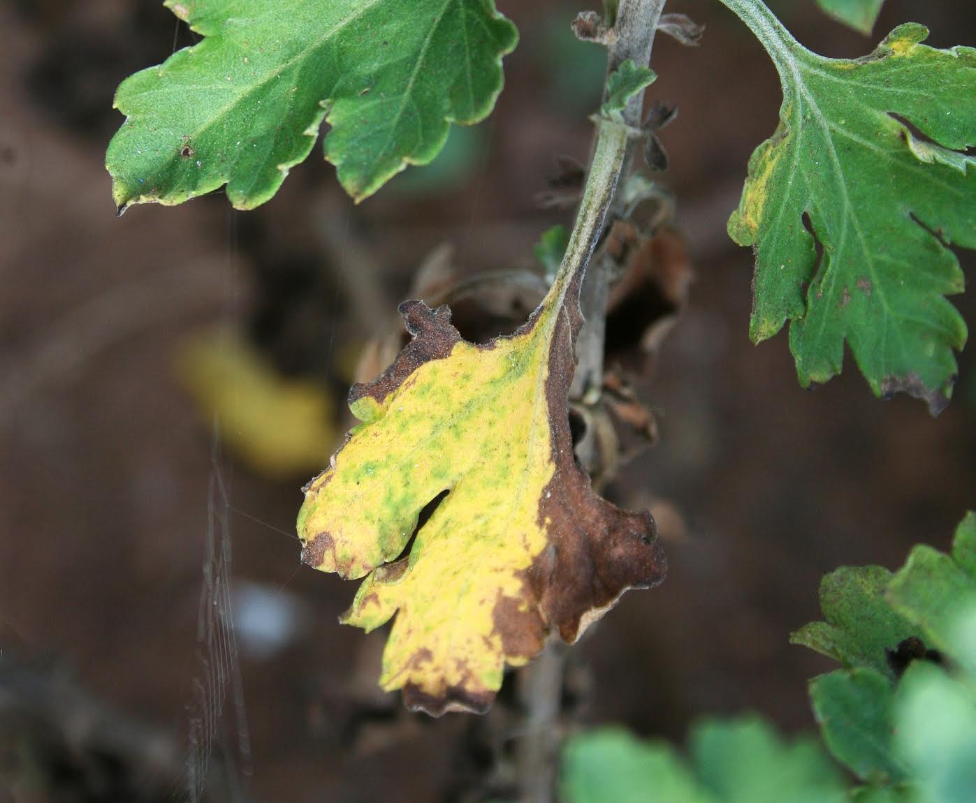 El amarilleamiento de las hojas de los crisantemos también puede indicar un problema más grave con sus plantas de crisantemo. Entre ellos se encuentran la marchitez por fusarium y el moteado clorótico. La marchitez por fusarium en los crisantemos a menudo marchita o amarillea los tejidos de la planta, y no existe ningún tratamiento que cure una planta infectada. Puede proteger las plantas sanas hasta cierto punto rociándolas con un fungicida, pero las plantas infectadas deben destruirse. Del mismo modo, no existe ningún tratamiento para el moteado clorótico. Lo único que puede hacer es destruir las plantas infectadas con hojas amarillas. También es conveniente desinfectar las herramientas de jardín que utilice en las plantas y asegurarse de no tocar los crisantemos sanos después de manipular las plantas infectadas.