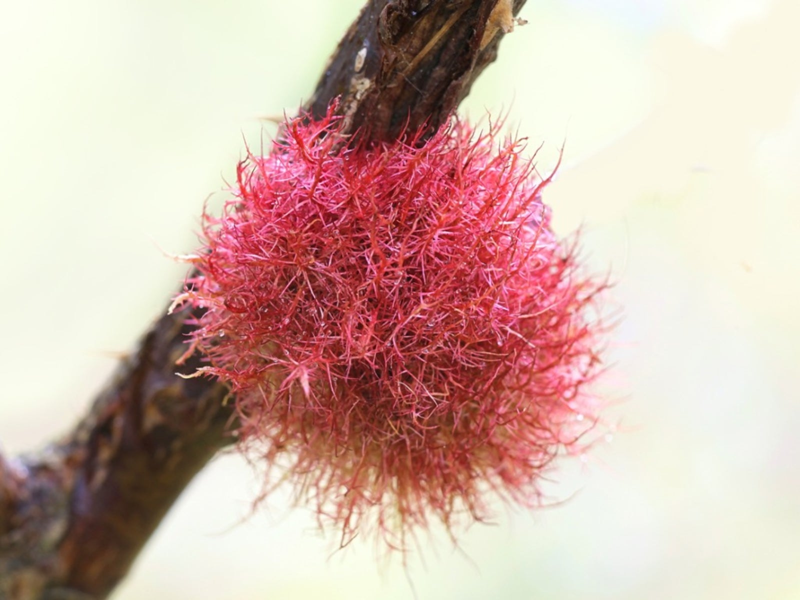 Första gången jag såg gallbildningar på rosenbuskar var när en långvarig medlem i vår lokala rosförening ringde och bad mig komma och titta på några märkliga utväxter på några av hans rosenbuskar. Två av hans äldre rosenbuskar hade områden på flera grenar där runda utväxter stuckit ut. De runda utväxterna hade små taggar som liknade nya rosenkvistar. Vi beskärde bort några av utväxterna så att jag kunde undersöka dem närmare. Jag lade en av de runda utväxterna på min arbetsbänk och skar upp den försiktigt. Inuti fann jag en slät kammare med två små vita larver. När de utsattes för ljuset började de två larverna göra en snabb larvhula! Sedan slutade de plötsligt och rörde sig inte längre. Något med att utsättas för ljus och luft verkade orsaka deras död. Vad var det här? Läs vidare för att lära dig mer om cynipidsteklar och rosor.