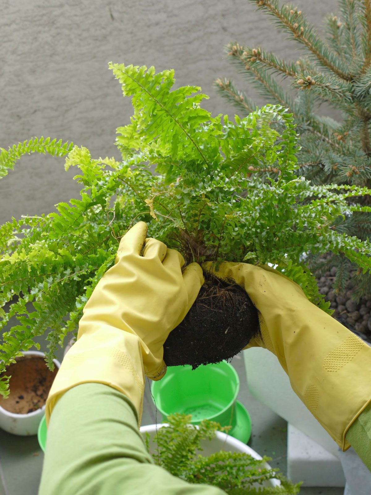 Förökning kan också uppnås genom att dela Bostonfern-växter. Låt först ormbunkens rötter torka ut lite och ta sedan bort Bostonfern från krukan. Skär ormbunkens rotklump i halvor med en stor, tandad kniv, sedan i fjärdedelar och slutligen i åttondelar. Skär av en bit på 2,5–5 cm och trimma bort alla rötter utom 4–5 cm, så att den passar i en 10–13 cm stor lerkruka. Lägg en bit av en trasig kruka eller en sten över dräneringshålet och tillsätt lite väl dränerande planteringsjord som täcker den nya ormbunkens rötter i mitten. Om bladverken ser lite sjuka ut kan de tas bort för att avslöja de unga, framväxande Boston-ormbunksskotten och fiddleheads. Håll den fuktig men inte våt (ställ krukan på några småstenar för att absorbera eventuellt stående vatten) och se din nya Boston-ormbunksbaby växa.