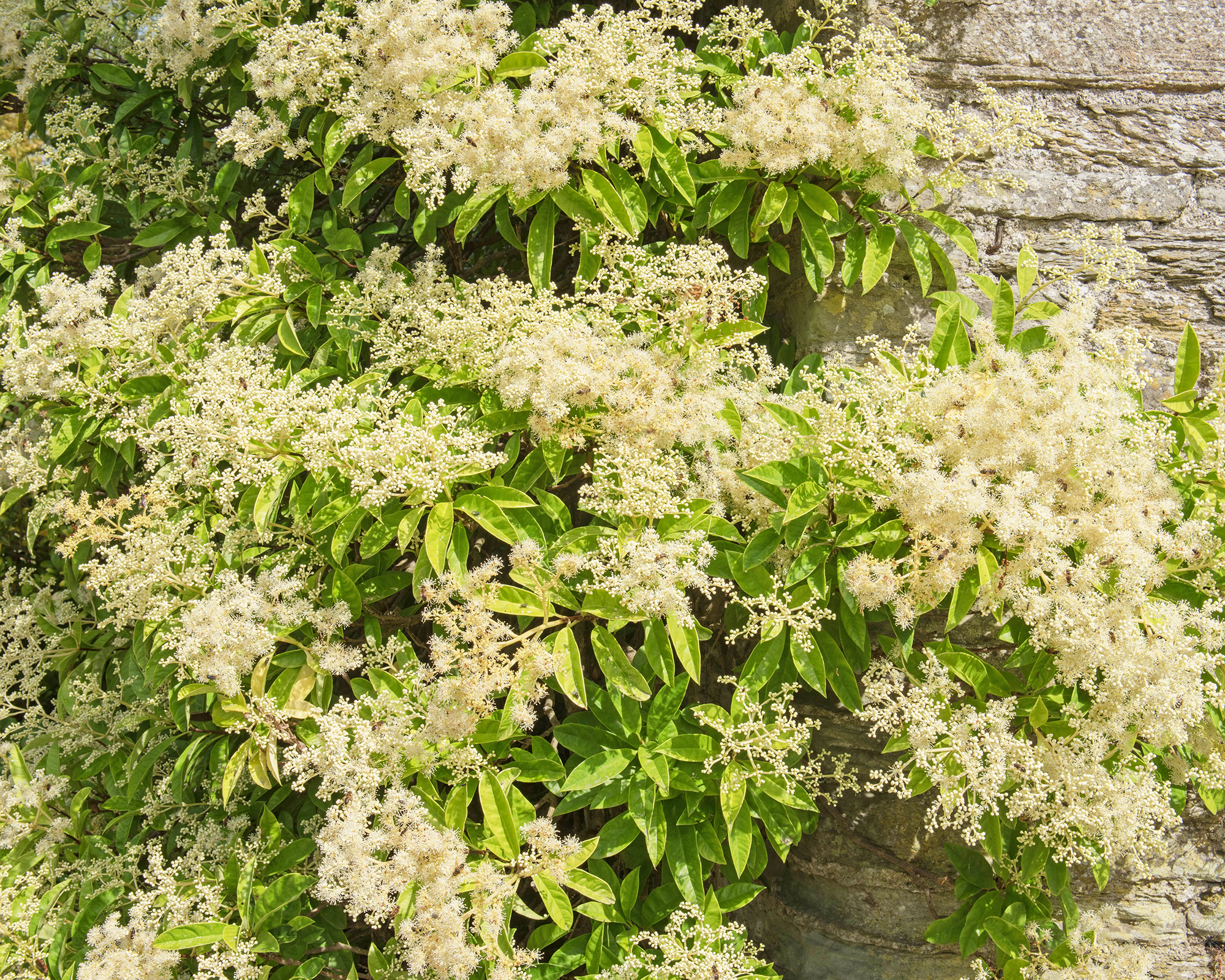 Résistant dans les zones 8 à 10, l’hortensia grimpant à feuilles persistantes Pileostegia viburnoides a un feuillage vert brillant attrayant et des panicules de fleurs blanc crème dentelées qui fleurissent en été et en automne.
