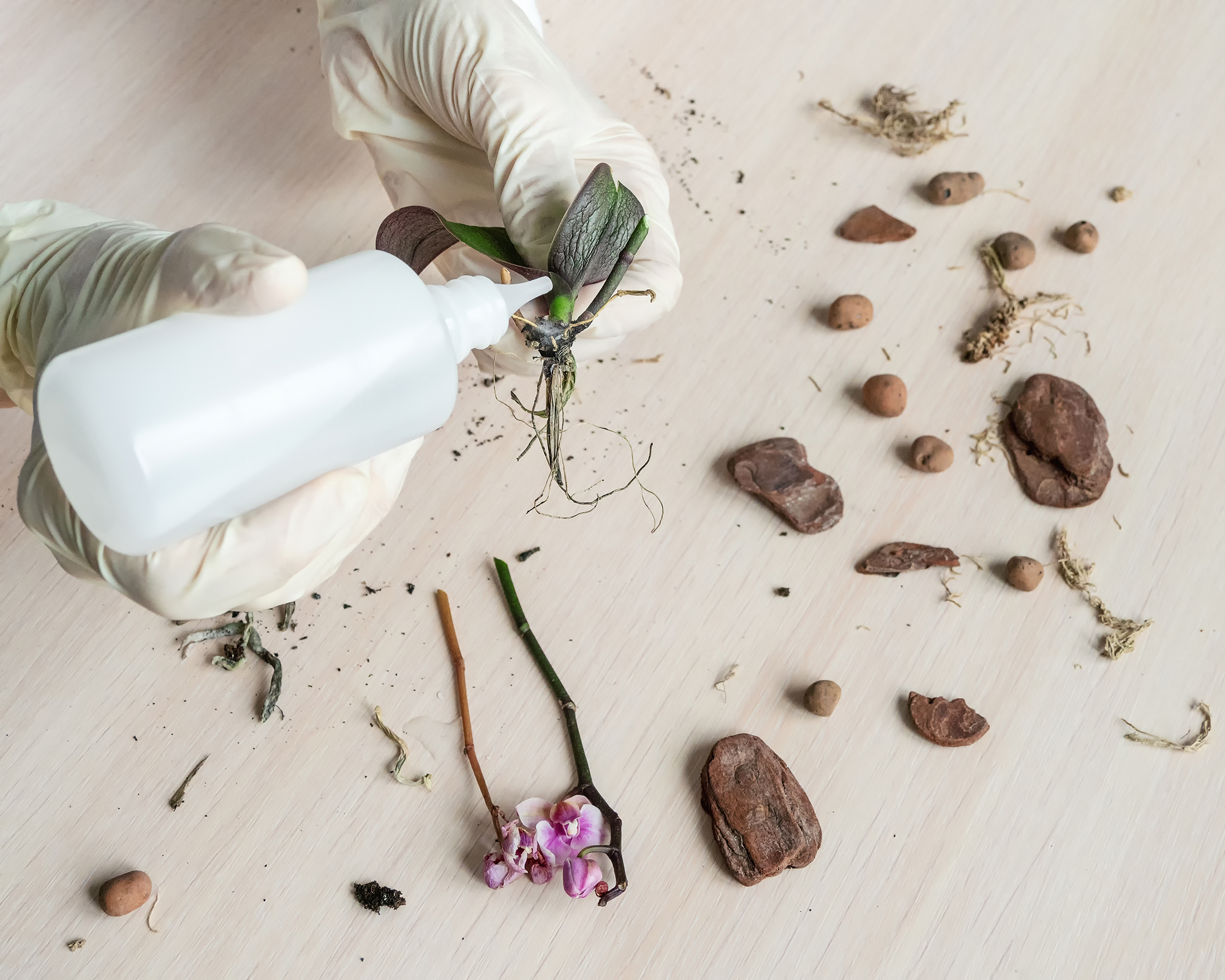 - Jetez l’ancien substrat et désinfectez le pot avec de l’eau de Javel.