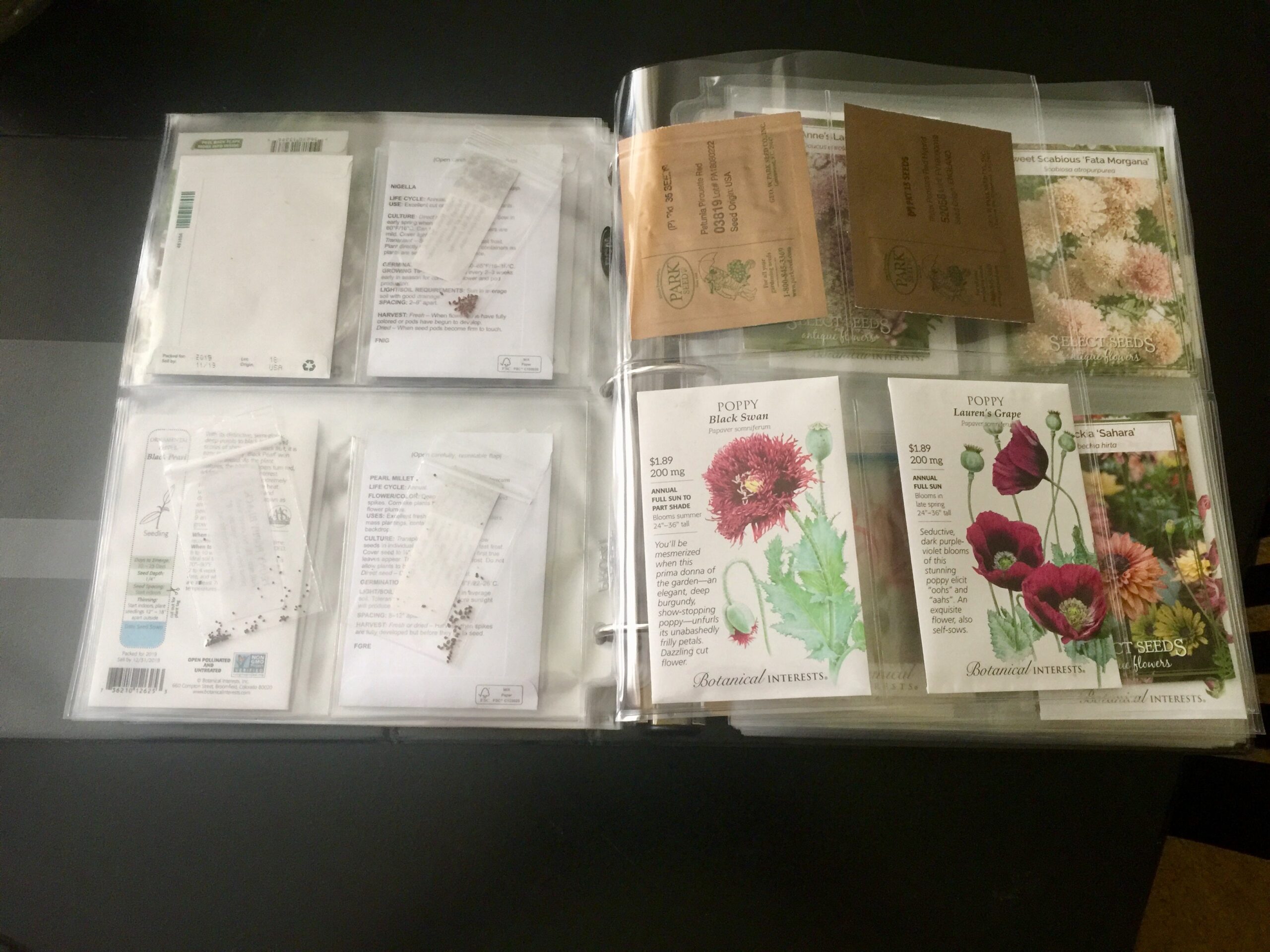 Dans un système doté de pochettes transparentes (un range-DVD ou des intercalaires pour classeur, par exemple), vous pouvez retourner les sachets de graines afin que les informations relatives à la plantation et la date soient clairement visibles. Chaque pochette peut contenir deux sachets de graines, un de chaque côté, ce qui facilite la consultation des informations nécessaires.