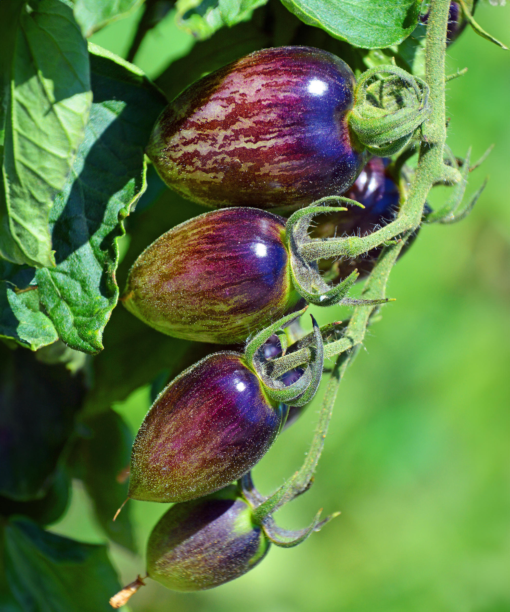 - Brad’s Atomic Grape : Plus gros qu’une tomate cerise, mais pouvant tout de même être mangé en quelques bouchées, ce fruit est absolument magnifique. De forme oblongue et rayé de lavande, de vert et de violet. Prêt à être consommé en 75 jours.