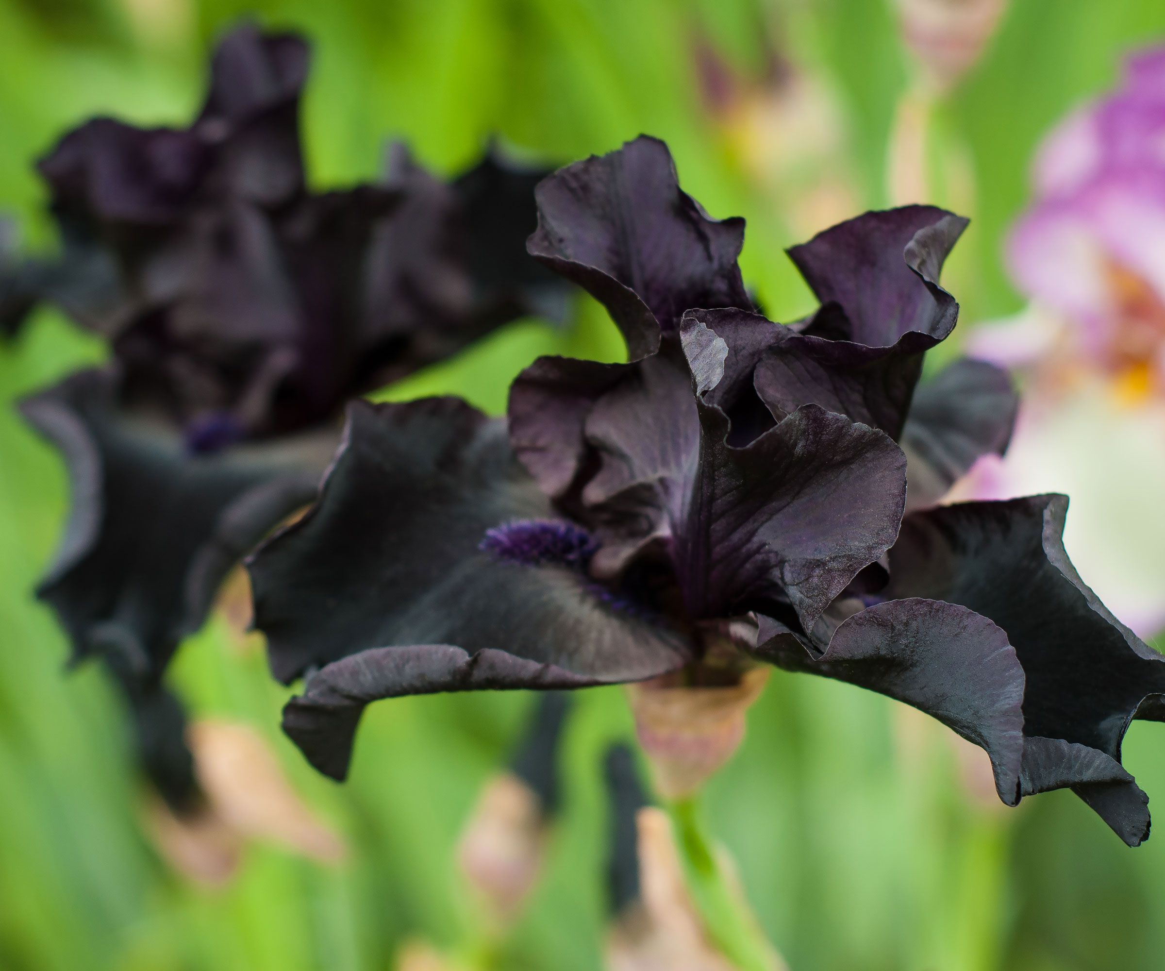 Les variétés d’iris barbus de couleur violet foncé ou noir sont très courantes. « Dark Vader » en est un exemple, produisant à la fois des étendards et des falls foncés. De petite taille, cet iris est idéal pour un parterre ou une bordure noire, ou encore pour un pot à thème.