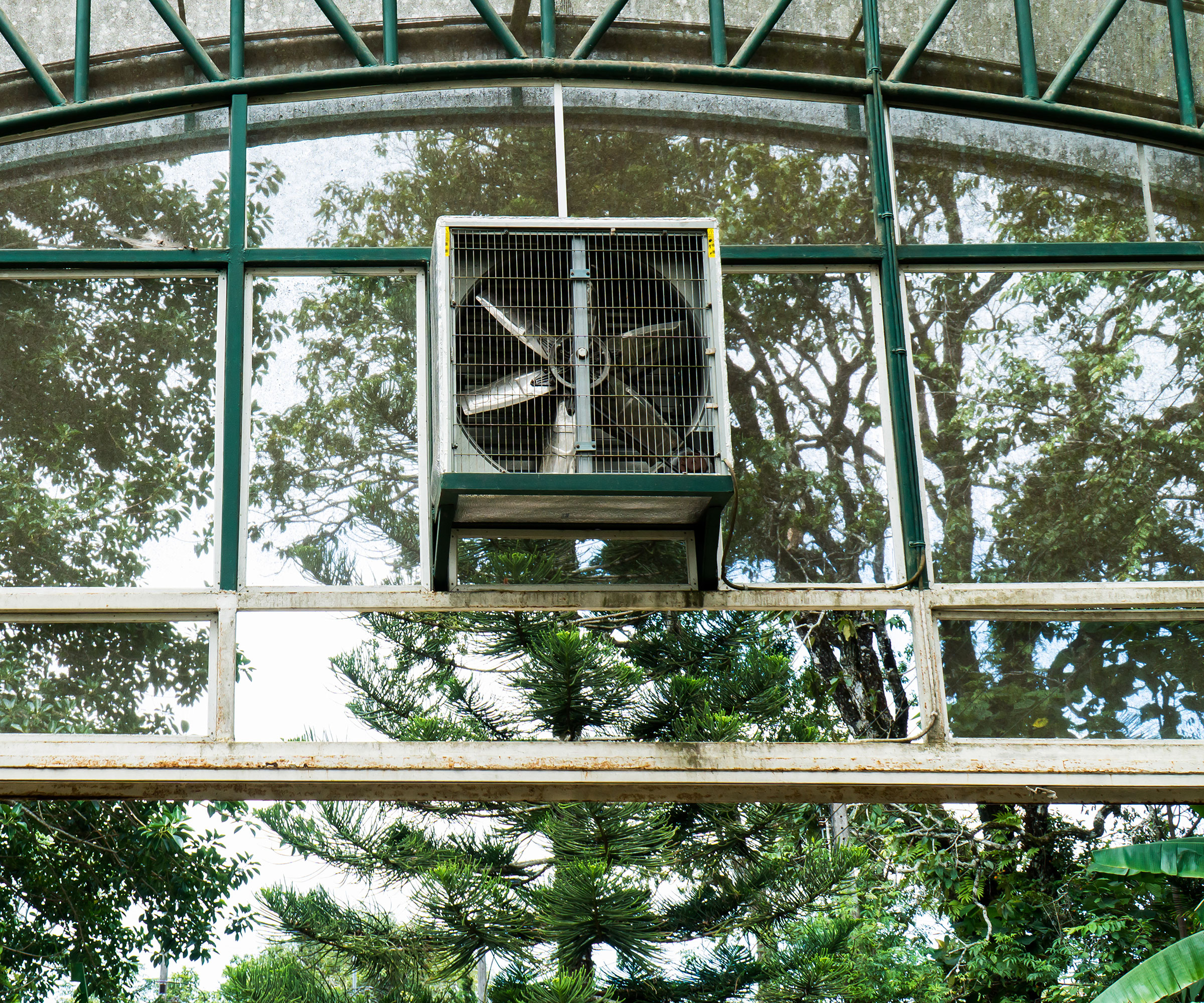 Dans les serres qui utilisent des feuilles de polyéthylène pour ombrager le toit, l’ajout d’évents est problématique, c’est pourquoi elles utilisent des ventilateurs pour aspirer l’air à travers les parois d’extrémité à persiennes opposées. Dans les très grandes serres, il est plus facile d’utiliser un système de toit ouvert qui s’ouvre vers le haut ou coulisse sur le côté. Cela présente l’avantage supplémentaire de permettre aux plantes de se durcir sans les sortir de la serre.