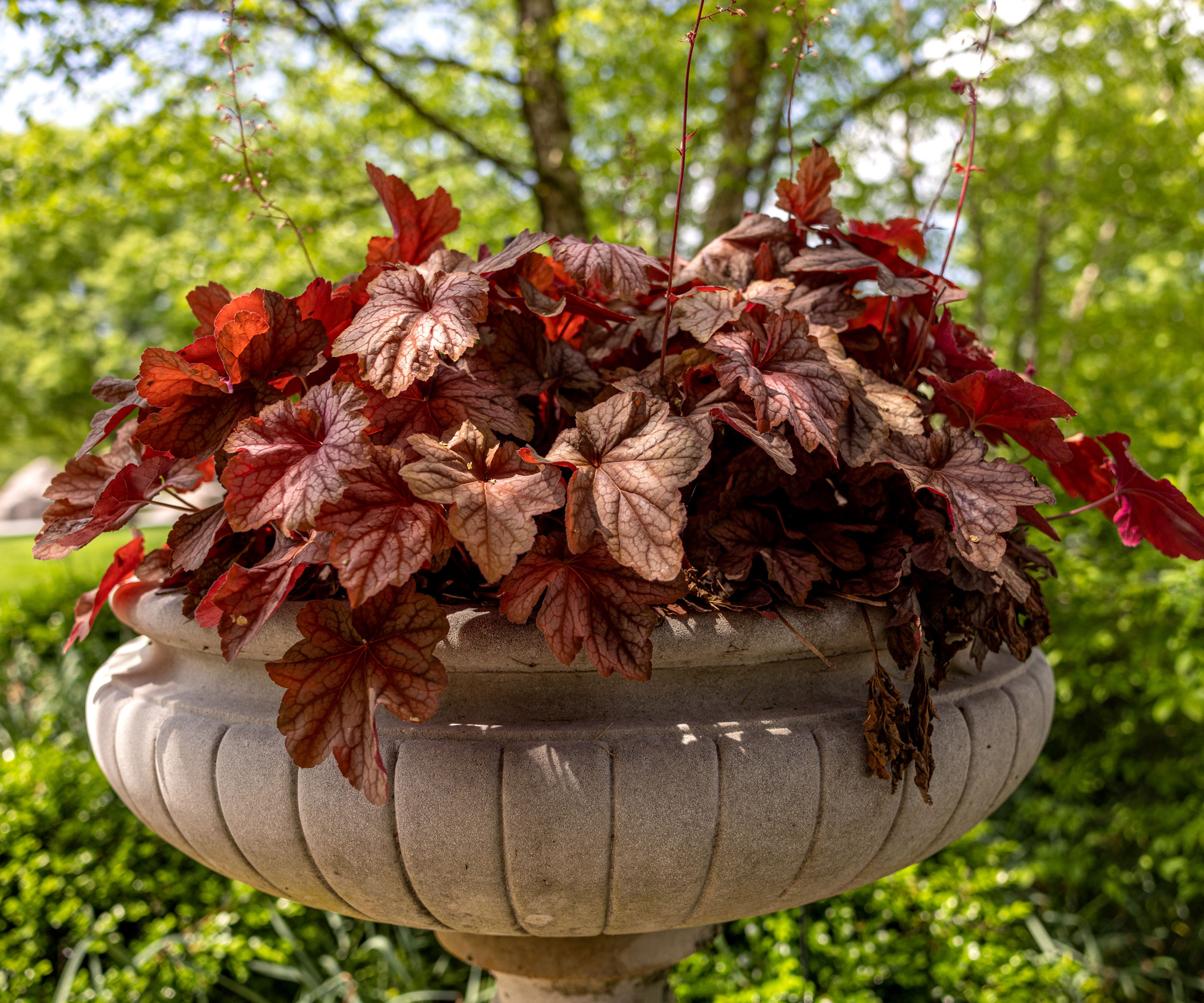 Que vous préfériez les couleurs subtiles et mélancoliques (comme le « Vino » chocolat bordeaux) ou vives et éclatantes (comme le « Wasabi » vert lime), une combinaison de coléus en pot constituera un magnifique point de mire. Veillez simplement à cultiver ensemble des variétés de coléus spécialement sélectionnées pour s’épanouir à l’ombre (certaines préfèrent davantage le soleil). De plus, pincez les fleurs dès leur apparition afin de mettre l’accent sur ces feuilles aux couleurs éclatantes.