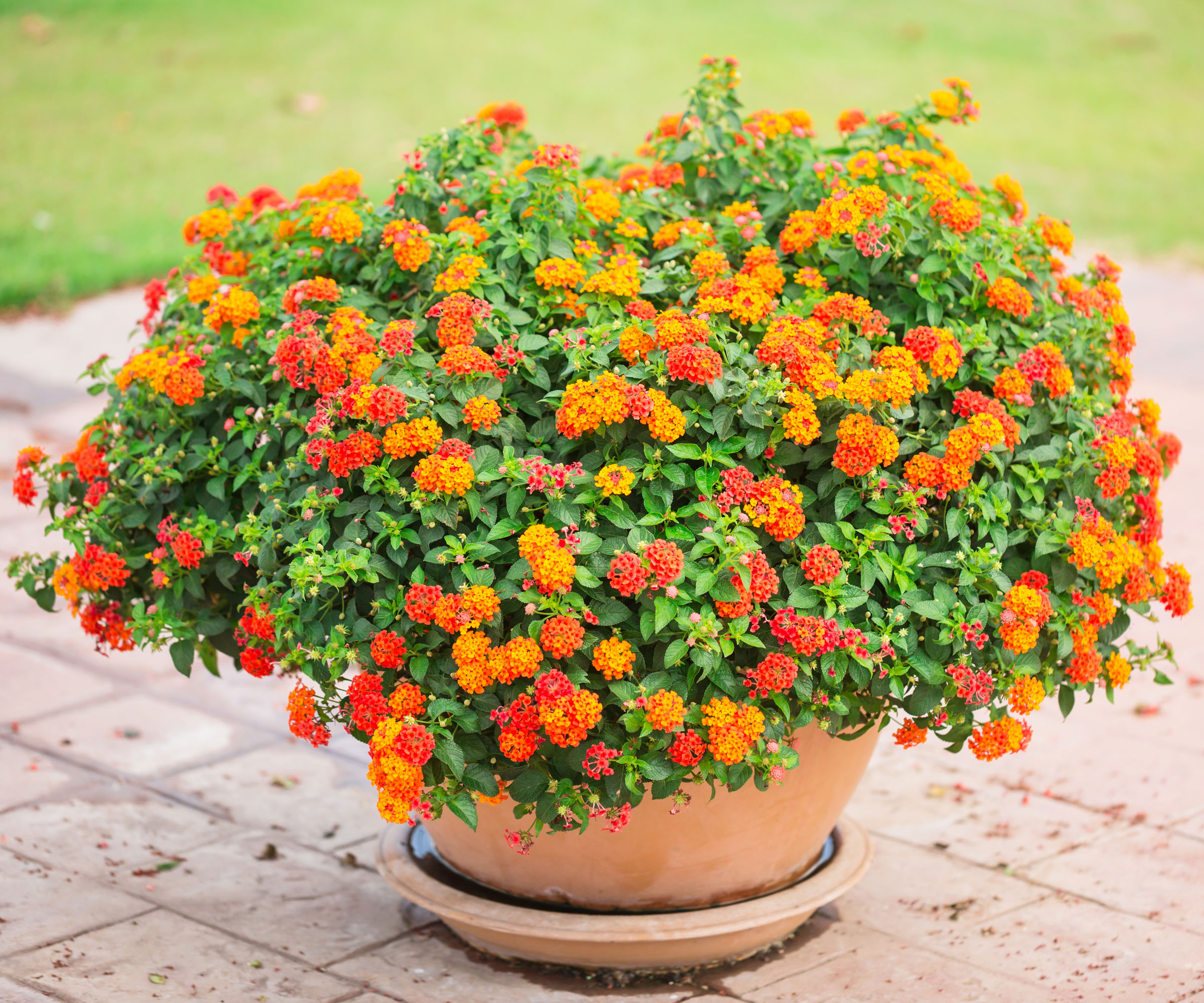 Cette plante vivace à croissance rapide, avec ses grappes de fleurs aux couleurs vives, est considérée comme envahissante dans certaines régions. Cependant, il est possible de cultiver les lantanas en toute sécurité dans des pots, où ils constituent un élément décoratif très apprécié. Un pot de patio est un excellent moyen de profiter de ces fleurs joyeuses qui, à mesure qu’elles mûrissent, se parent d’une multitude de couleurs. Parmi les variétés de lantanas adaptées à la chaleur estivale, on peut citer la série « Bandana », « Patriot » et « Luscious Grape ».