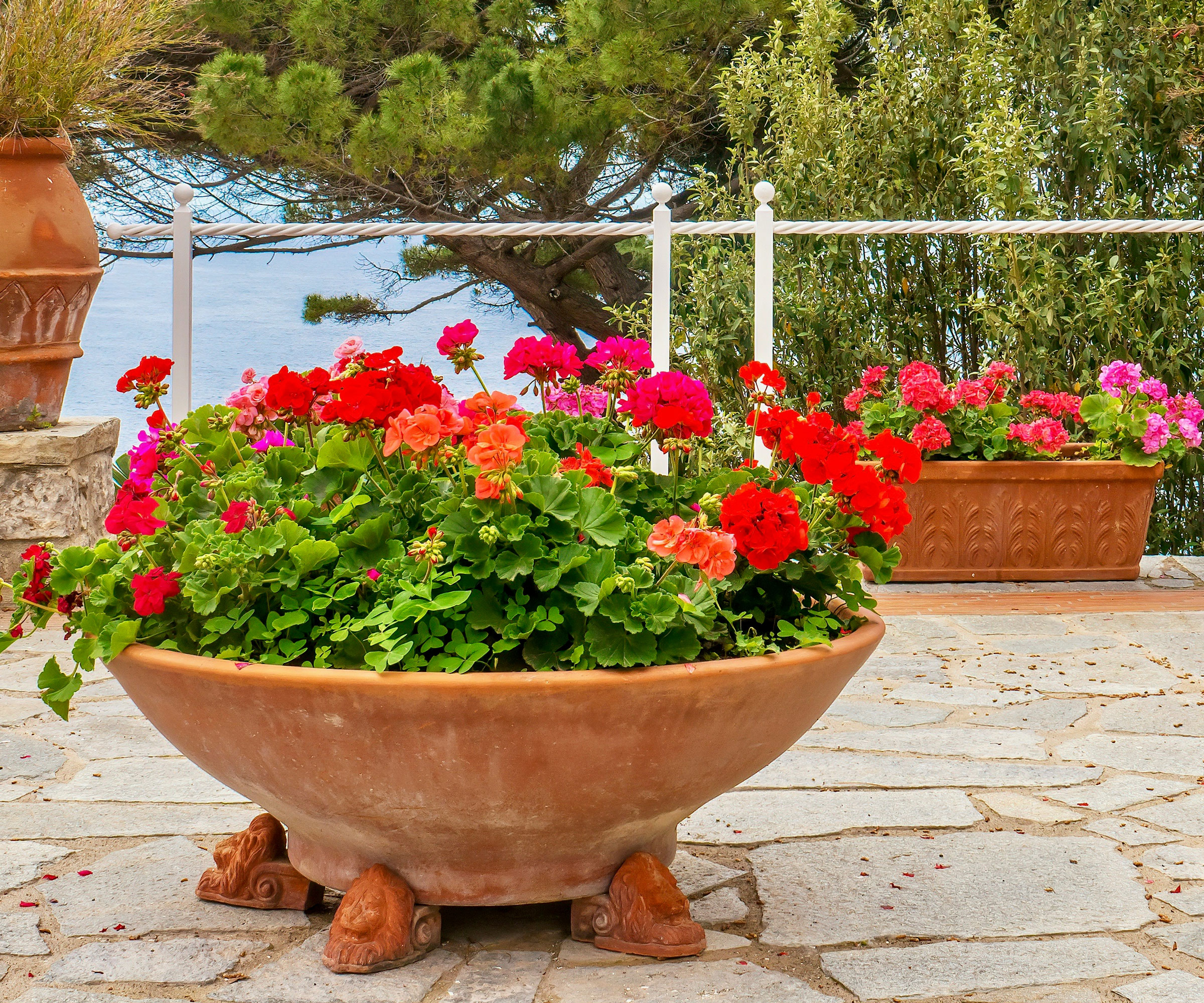 Le géranium est une autre plante classique pour les pots d’extérieur, grâce à ses fleurs lumineuses, son parfum caractéristique et ses feuilles attrayantes. Ces plantes annuelles joyeuses sont parfaites pour les pots de patio. Elles survivent à quelques arrosages manqués et continuent de fleurir tout l’été. Il suffit de couper les fleurs fanées pour favoriser une nouvelle floraison.