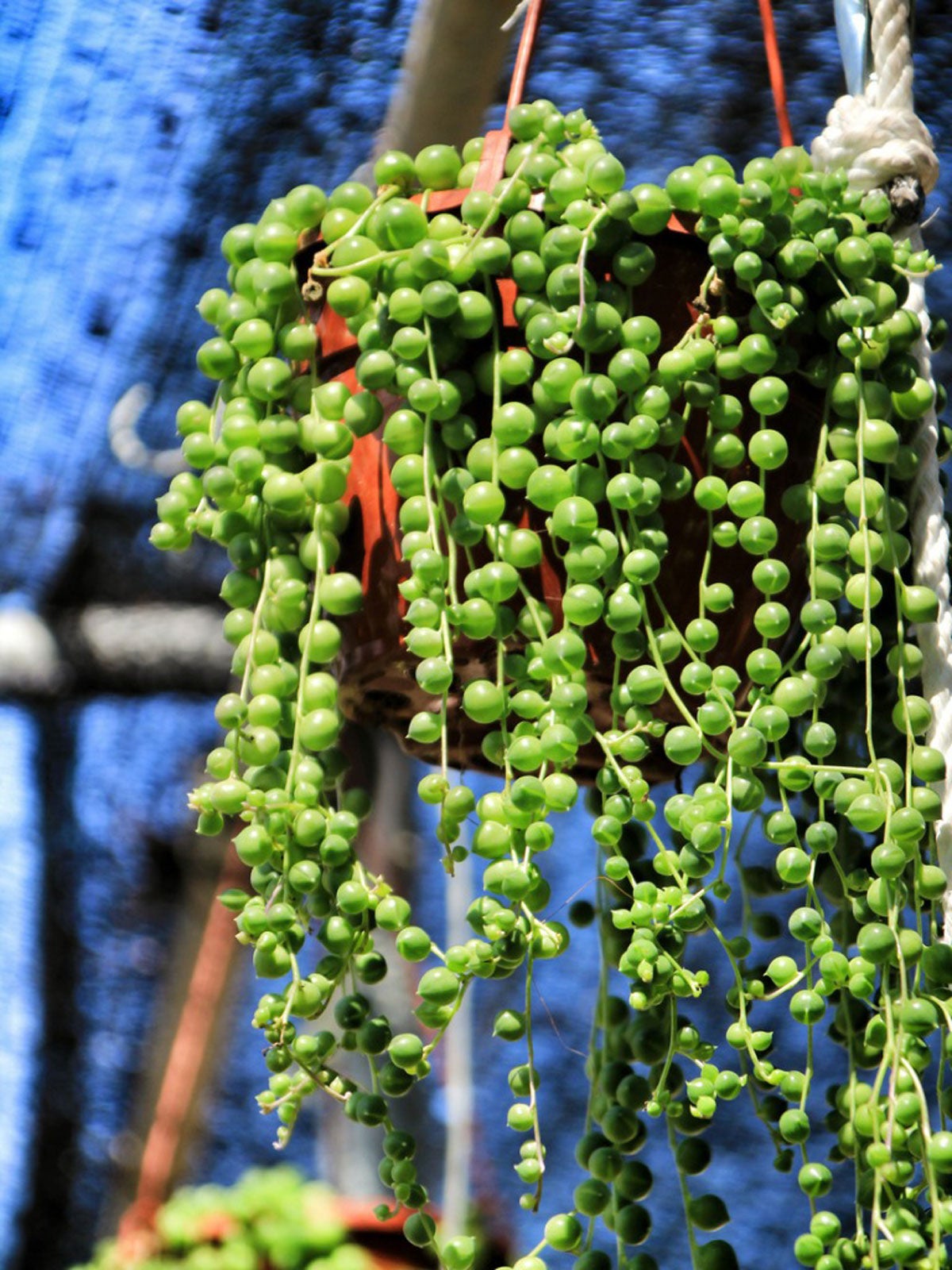 - Guirlande de perles (Senecio rowleyanus) – Cette plante succulente facile à entretenir ressemble à un collier de perles avec son feuillage vert charnu en forme de pois, et la guirlande de perles est du plus bel effet dans des paniers suspendus.