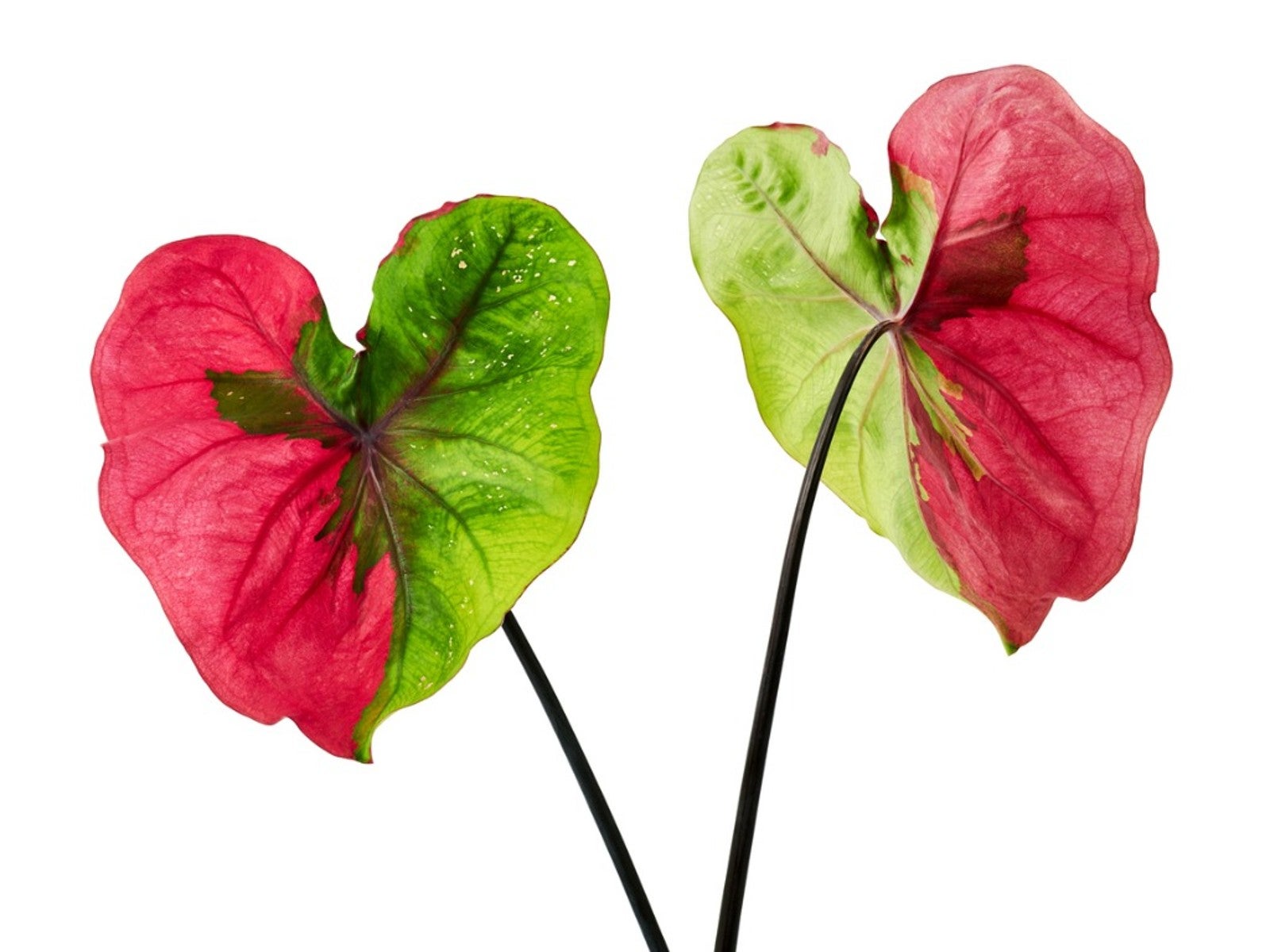 Caladium – Caladium är prydda med färgglada, hjärtformade blad och är vackra växter att ge bort på Alla hjärtans dag. De kräver lite mer omsorg än vanliga krukväxter, och dessutom går de i dvala och bladen vissnar efter några månader.
