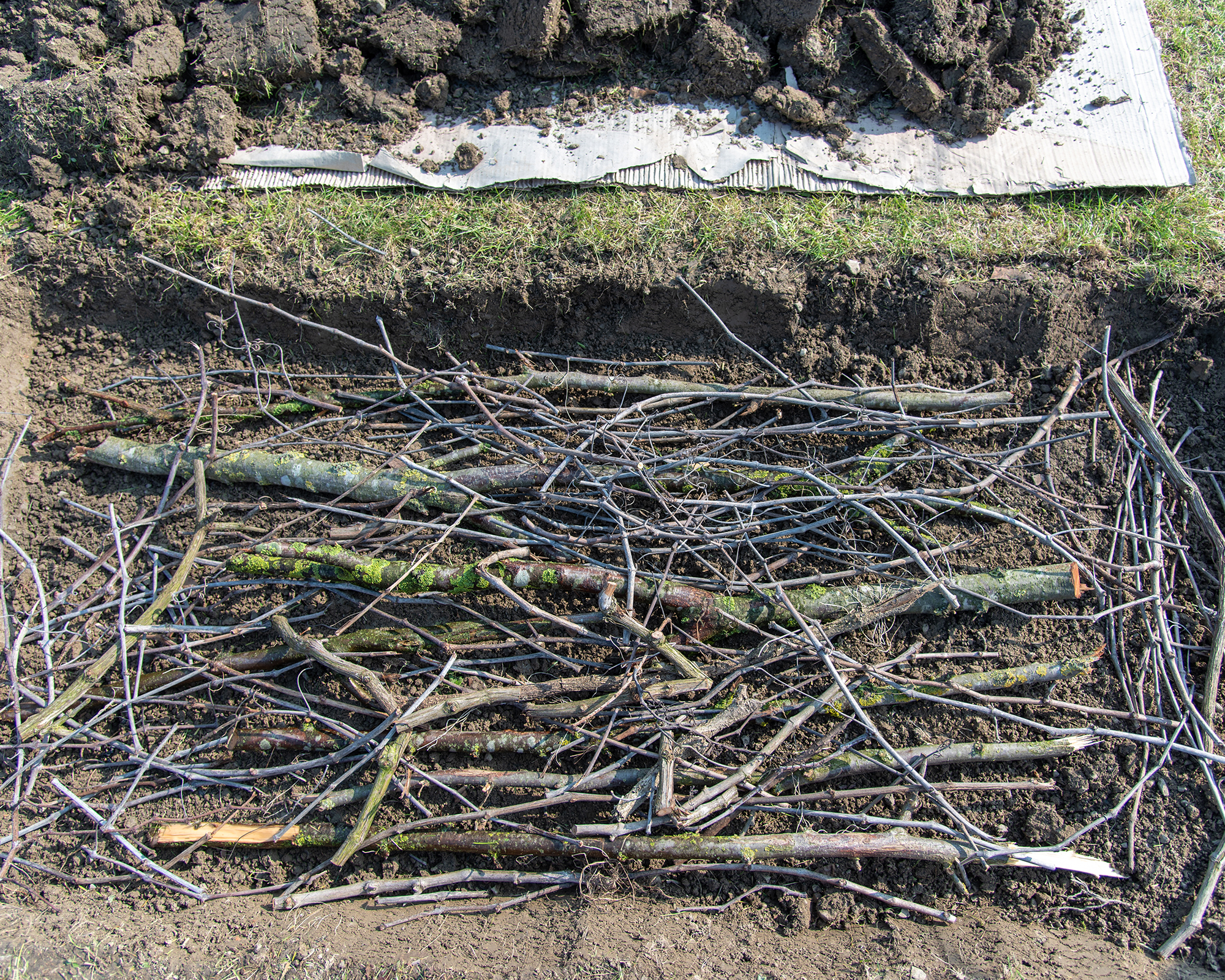 Lägg stockar och grenar i diket i en hög som är cirka 31 cm hög. Fukta träet ordentligt. Lägg sedan övervänd torv, tång, gräsklipp, gödsel, halm, löv eller kompost över stockarna och stapla detta material 10–15 cm högt.