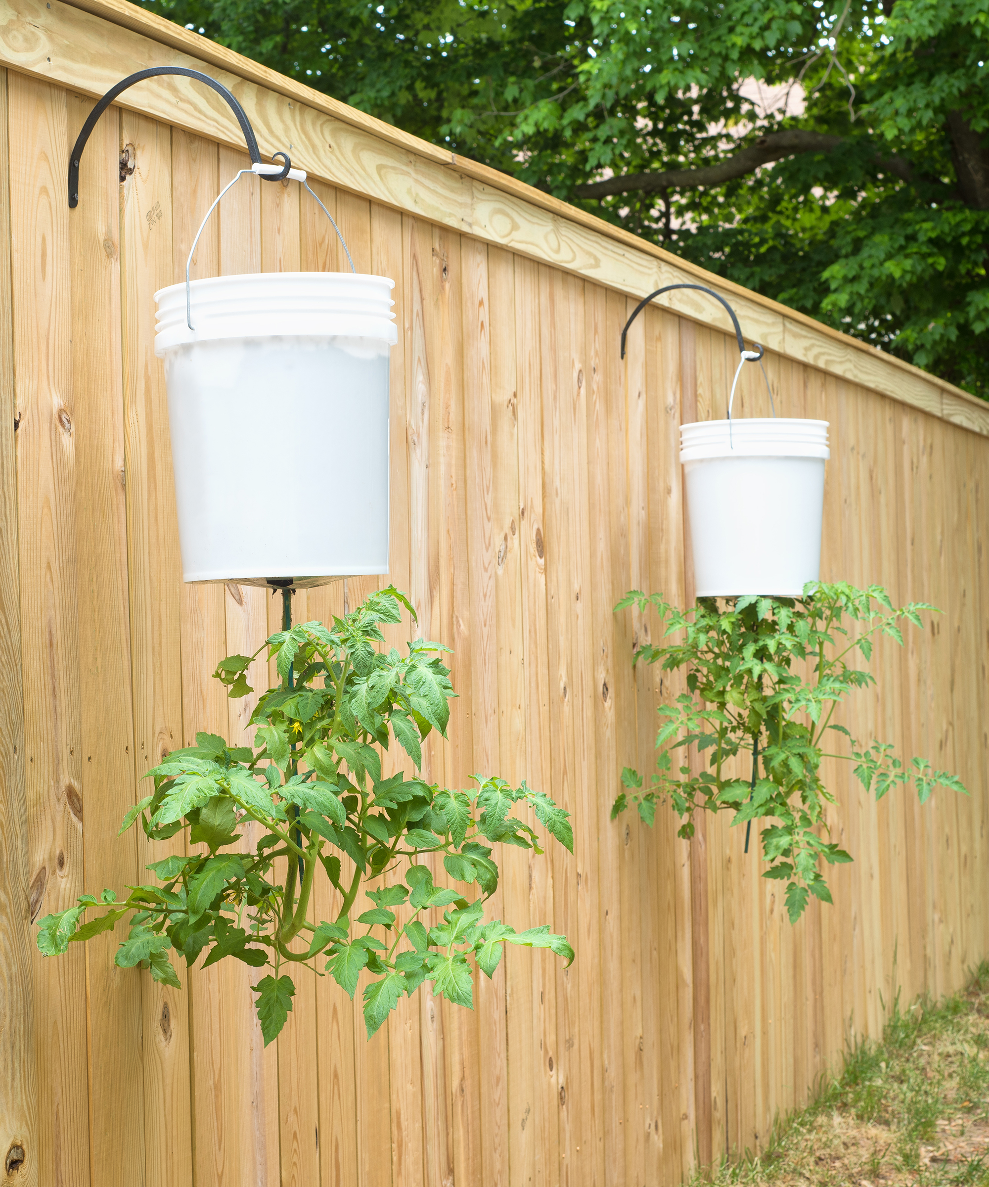 Om din hink har ett handtag kan du hänga upp den i det. Om inte, fäst en bit tråd överst för att använda som hängare. Välj om möjligt en ljus behållare. Mörkare färger gör att tomatplantans rötter blir för varma.