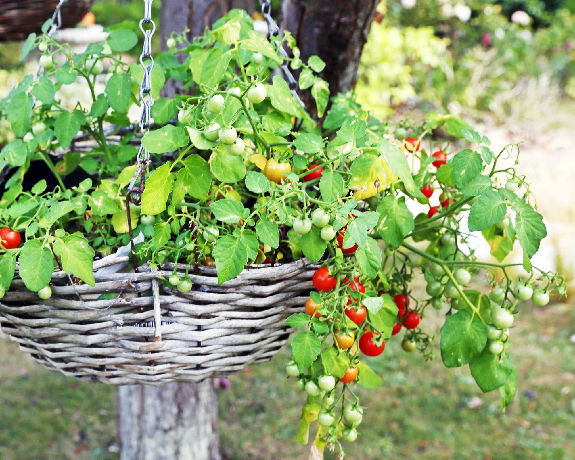 Att odla tomater i en hängande korg ger friare luftcirkulation, vilket bidrar till att minska sjukdomar. Det gör det också möjligt för trädgårdsmästaren att flytta växten efter behov för maximal sol exponering. Växterna behöver inte stöd eller burar och växer fritt, hängande ned från korgen.