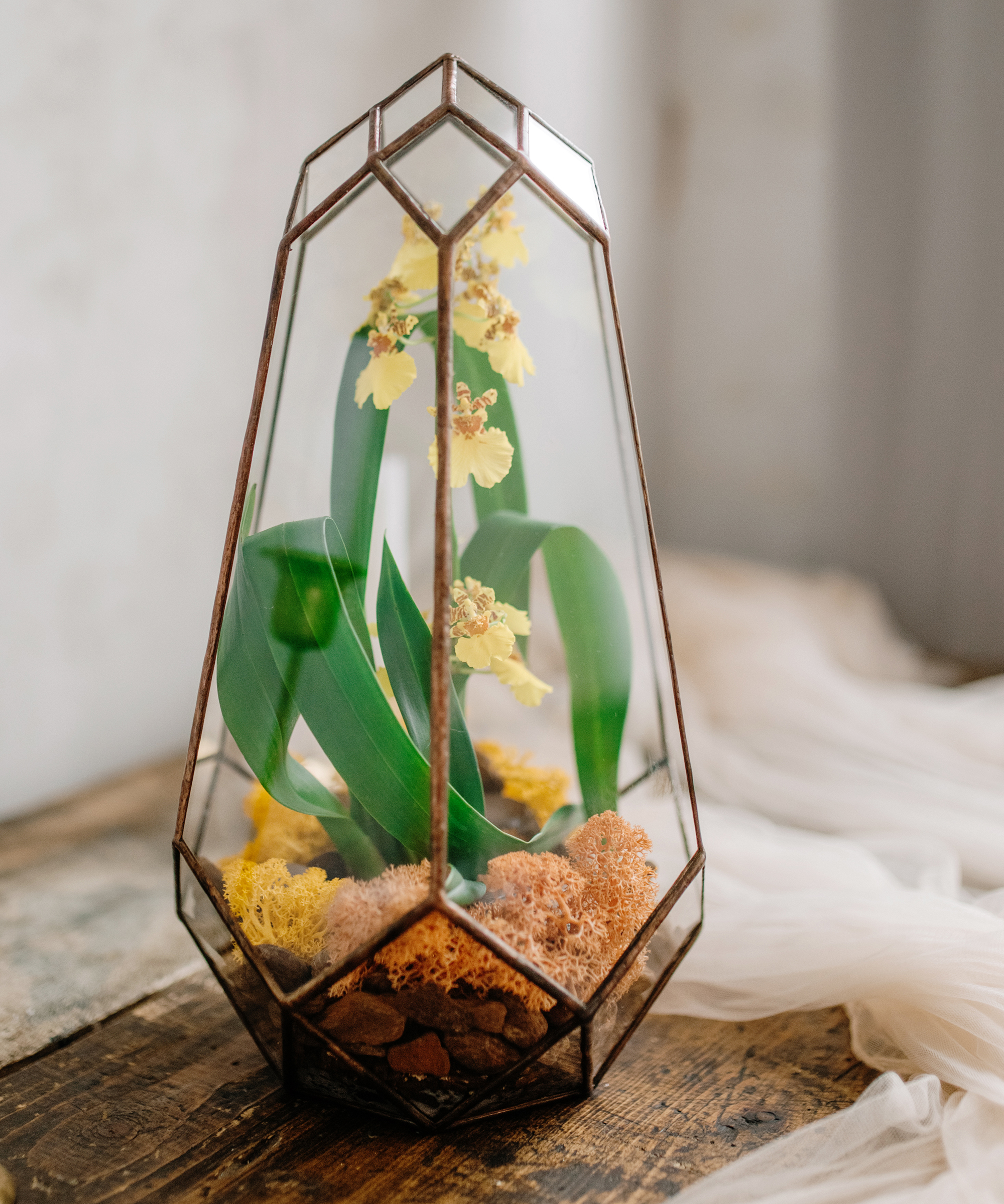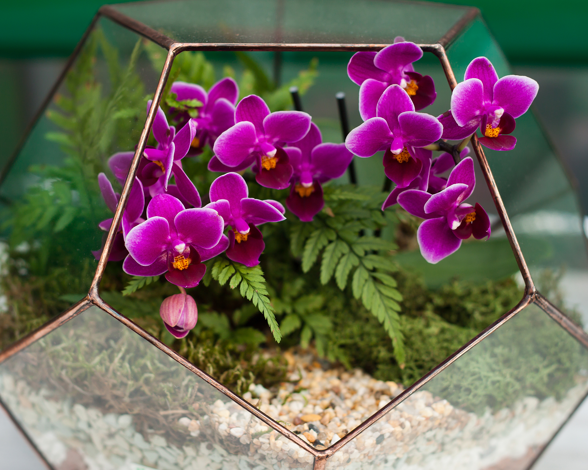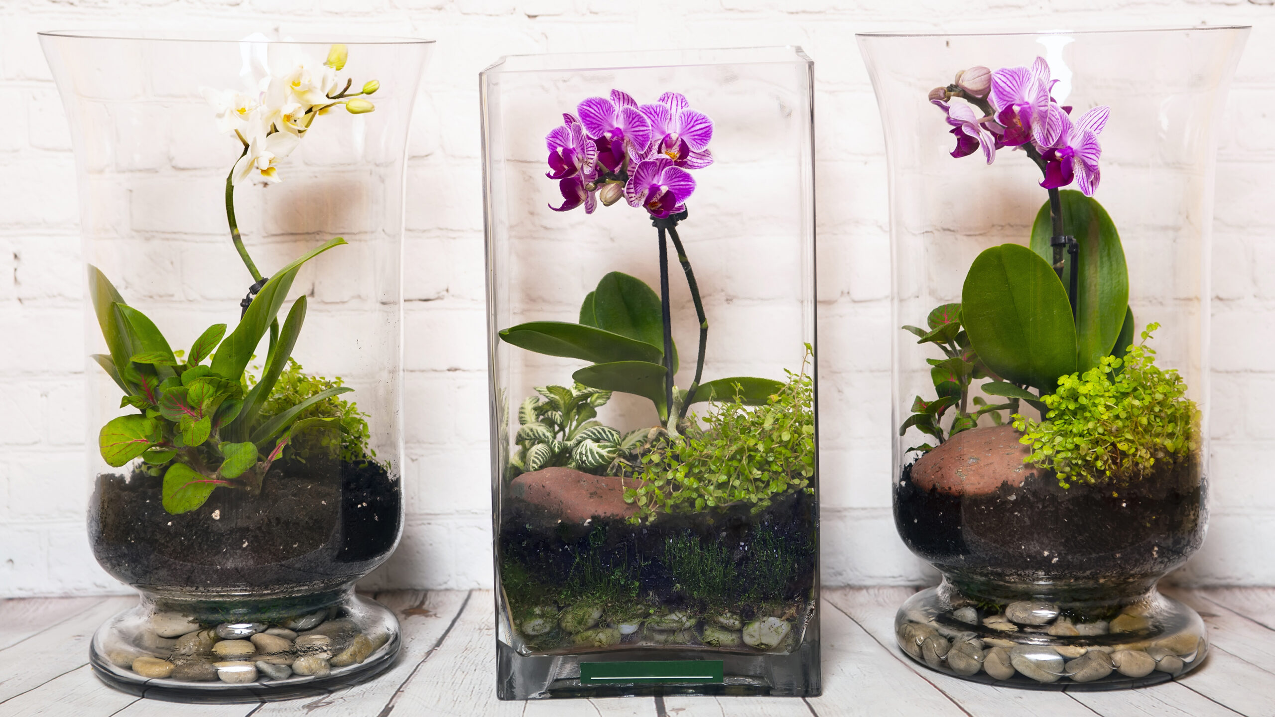 Orkidéer är skulpturala blommor som är perfekta som borddekorationer. När de väl har etablerat sig kräver de minimalt underhåll, eftersom den glaserade behållaren hjälper till att reglera temperaturen och främja luftfuktigheten, vilket minskar behovet av vattning.