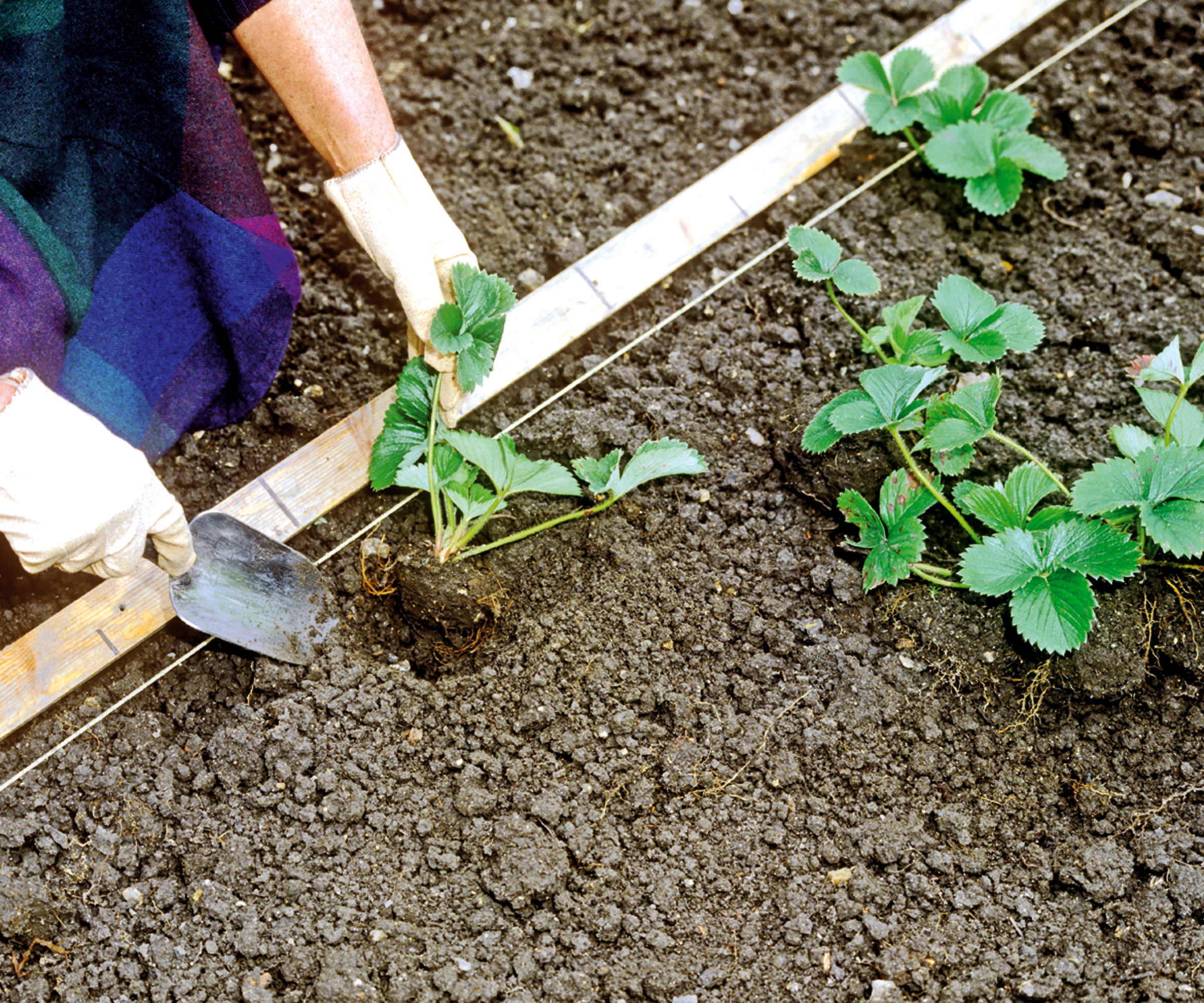 Plantera jordgubbsplantorna tillräckligt djupt i jorden för att täcka rötterna med cirka 6 mm, så att kronorna är synliga. Kronans bas ska vara i marknivå.