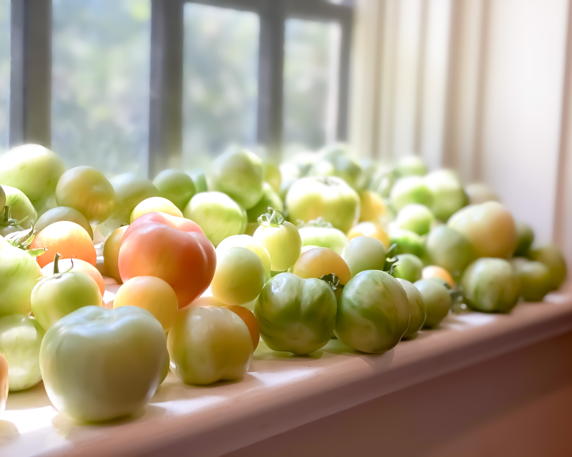 Istället lägger vissa trädgårdsmästare frukterna i ett enda lager i kartonger i ett mörkt rum, där de skyddas från ljus, som kan påverka smaken och göra skalet hårdare. Vissa odlare lindar in varje tomat i tidningspapper eller vaxpapper för att blockera ljuset, bevara fukten och förhindra att etylen påskyndar mognaden av hela partiet. Odlare i det fuktiga östra USA hänger ibland upp hela plantor inomhus, vilket skyddar dem från svampangrepp och låter frukterna mogna på vinstocken.