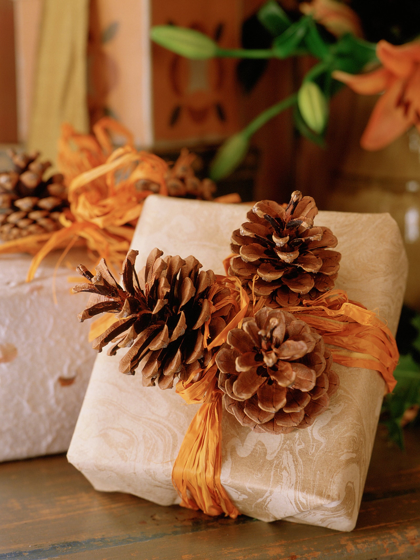 För att fästa kottarna på gåvorna måste du använda de nedre fjällen på kottarna och linda snöre, raffia eller band runt dem.