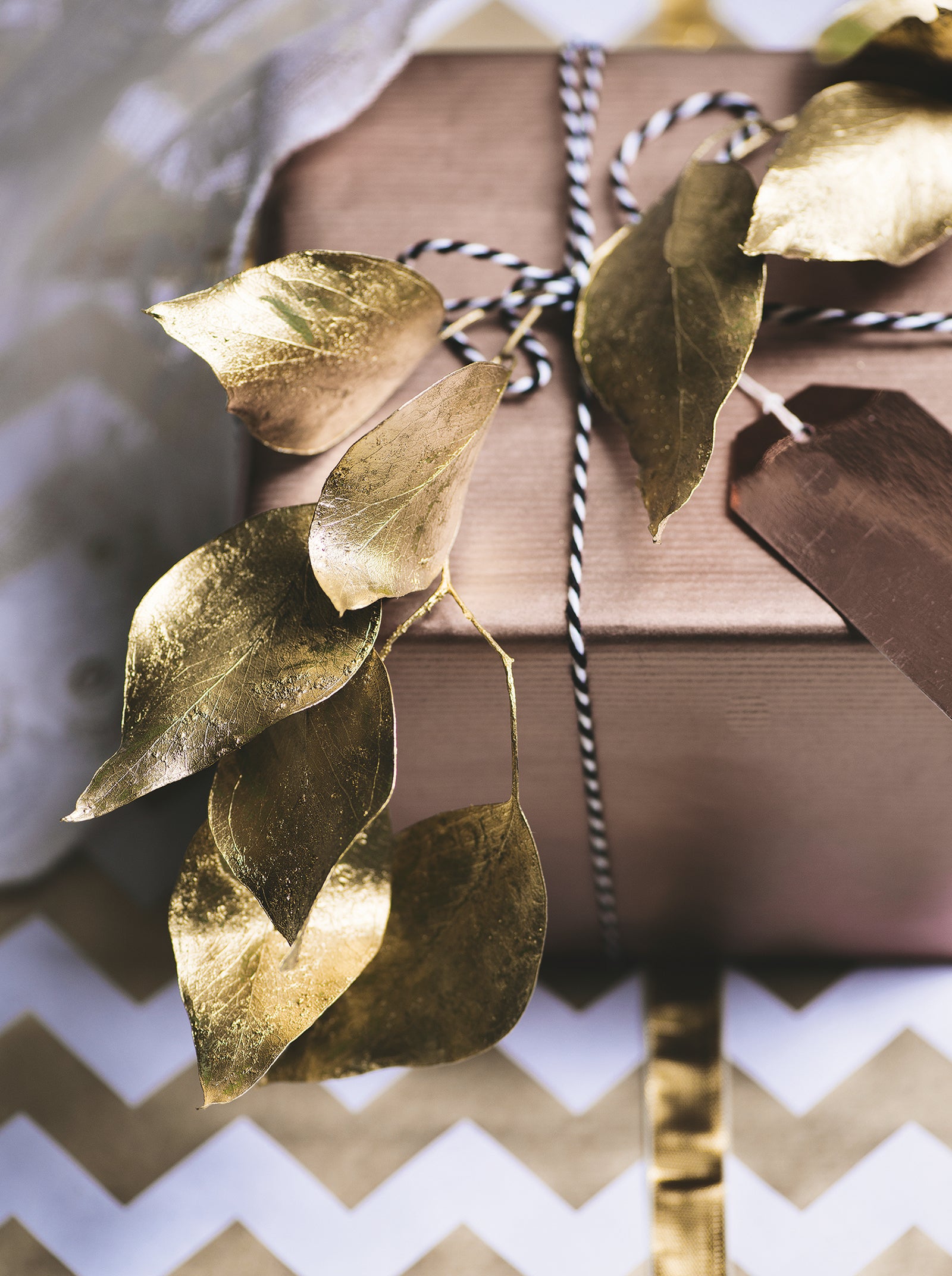 Glittrande metalliskt bladverk ger en lyxig touch till presentinslagningen och är så enkelt att åstadkomma.