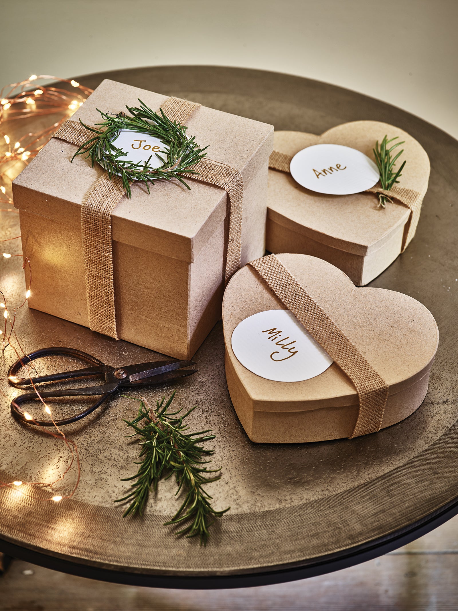 Brunt papper passar perfekt till dessa naturliga element, och gammal presentpapper kan återanvändas som ”band”.