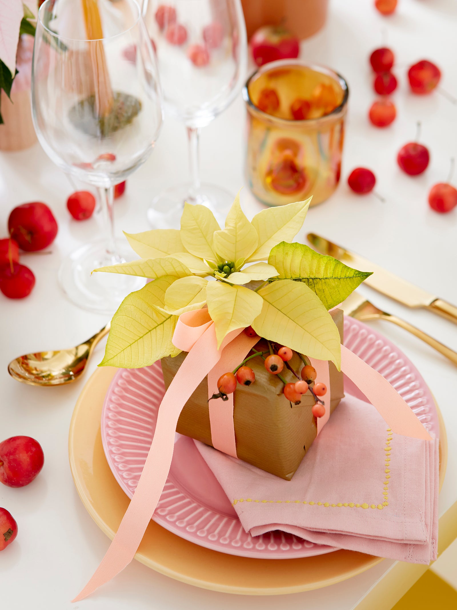 Växtens ”blommor” är egentligen högblad, och de passar utmärkt som presentdekoration. De är dock bäst när de är färska, så klipp av julstjärnan samma dag som du tänker ge bort presenten. Lämna kvar tillräckligt med stjälk så att du kan sticka in den i ett band.