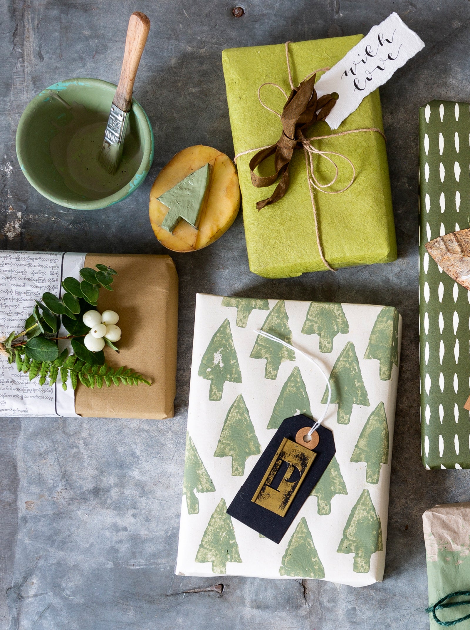 Om du vill ge designen en mer naturlig touch kan du använda löv från trädgården för att trycka på inslagningspapper, eller till och med citrusfrukter som du skär itu.
