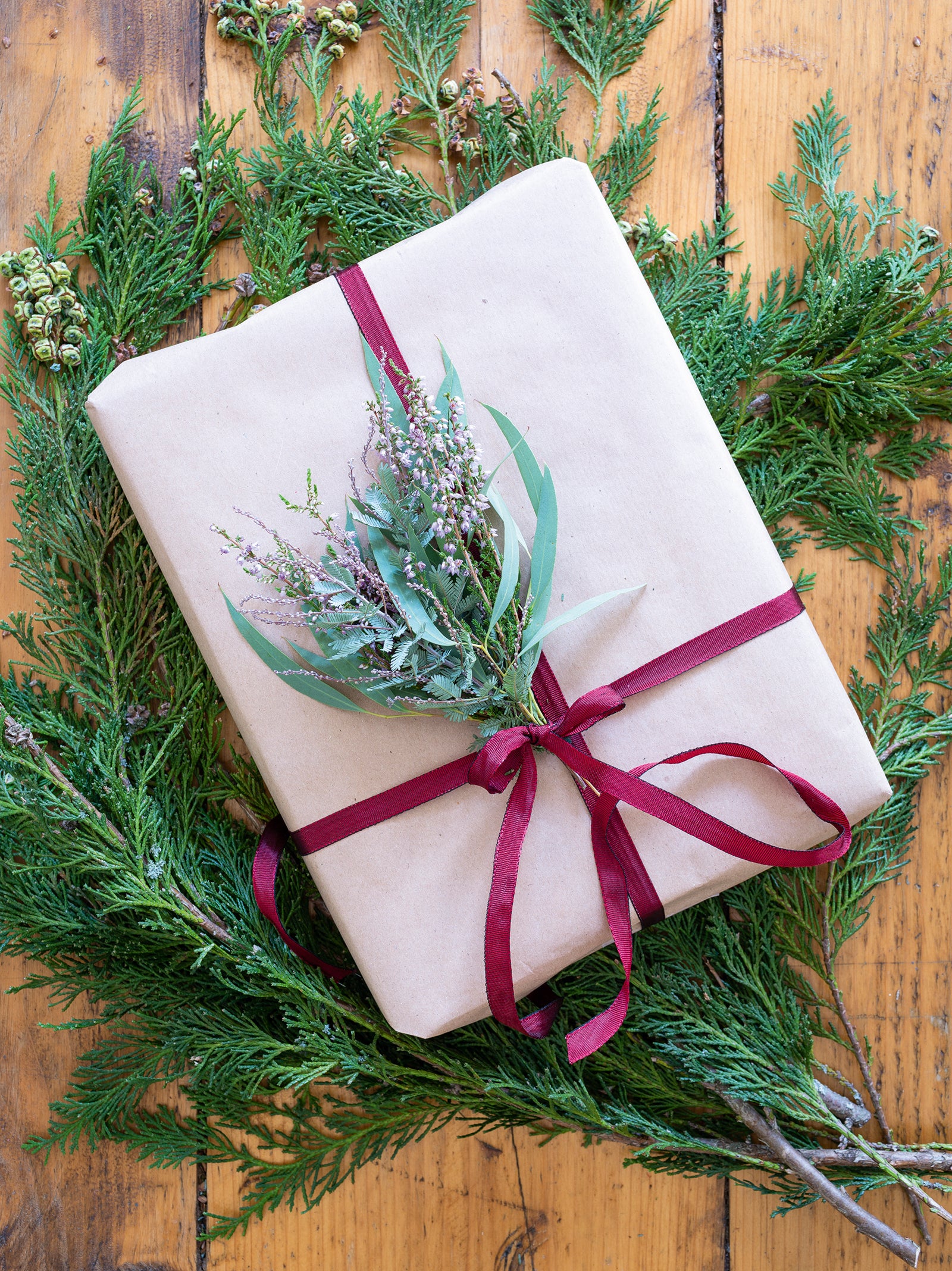 Du behöver inte lägga mycket pengar på mönstrat presentpapper – enkelt brunt papper är den perfekta bakgrunden för naturens rika färger.