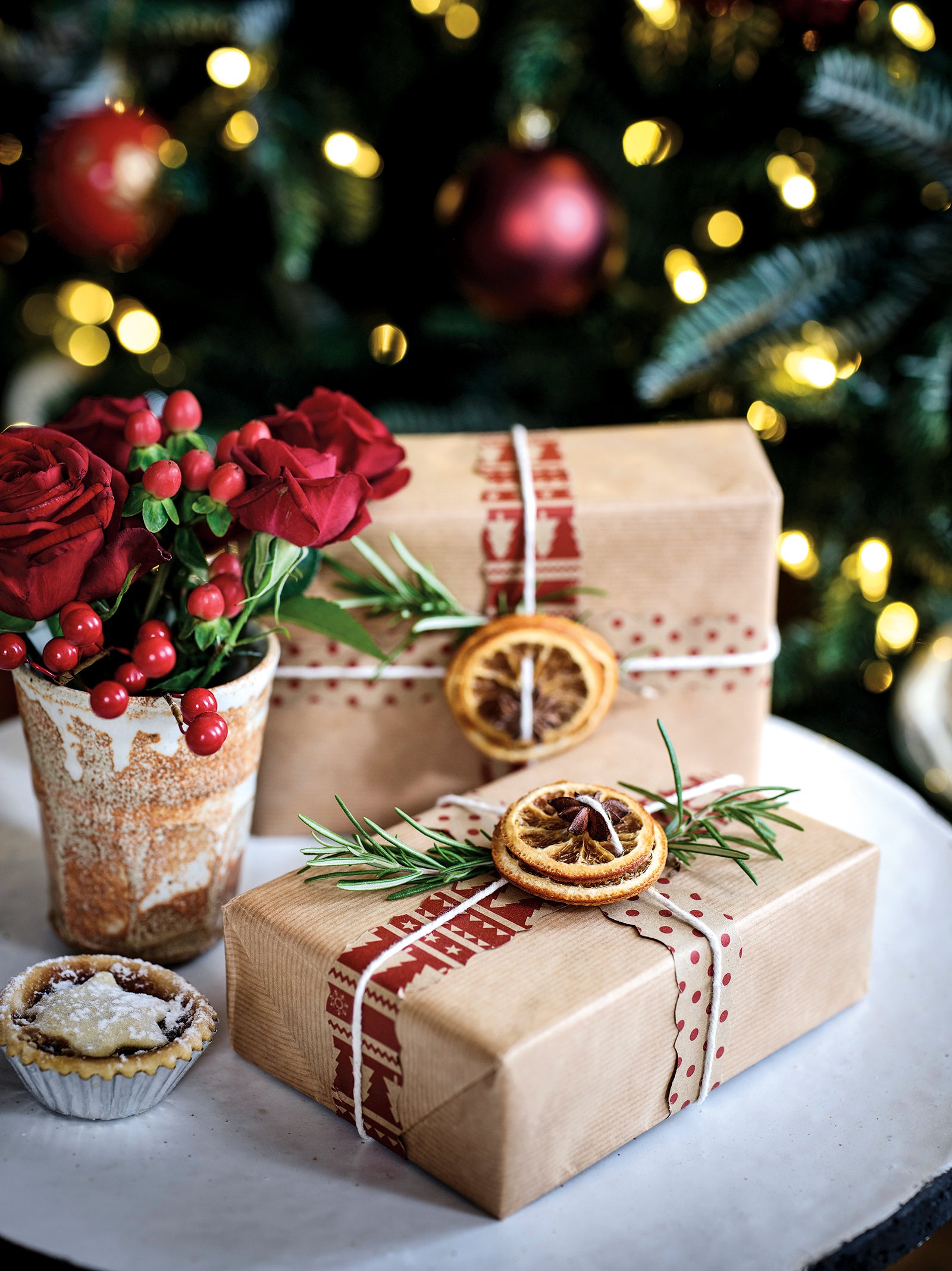 Torkade citrusfrukter ger en inbjudande värme och doft till presenter, särskilt när de kombineras med aromatisk rosmarin.