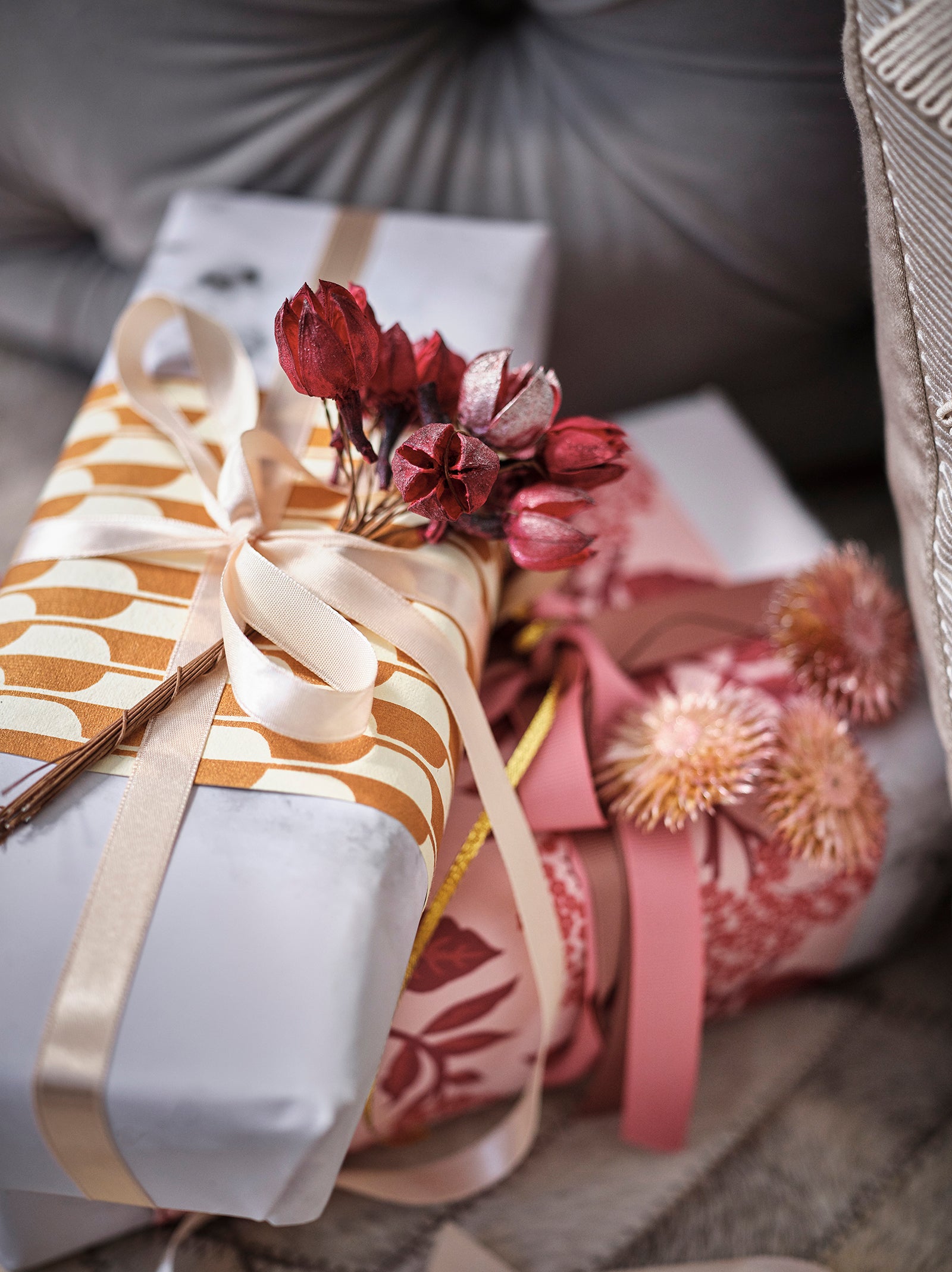 Varför inte göra din presentinslagning ännu mer hållbar genom att sträva efter noll avfall? Använd återanvändbara tygrester för att slå in dina presenter och dekorera med fynd från trädgården.