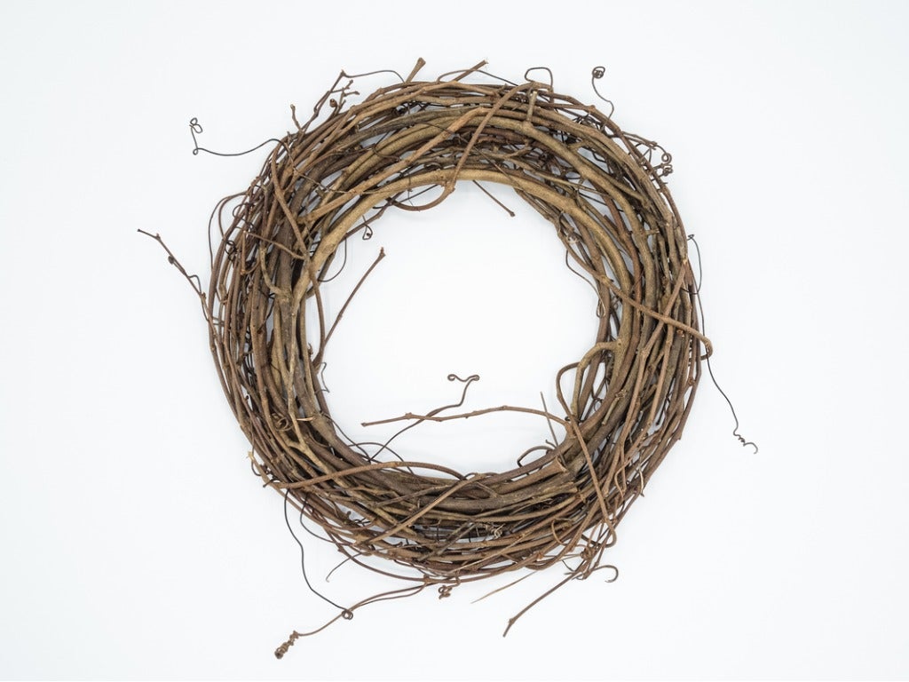 Nu är din DIY-krans av vinstockar klar att monteras. Använd flera långa strängar och linda dem till en cirkel i den storlek du vill ha din krans. Använd sedan andra strängar och linda dem runt och genom huvudcirkeln, använd rankorna för att hålla materialet på plats. Fortsätt linda tills du har den omkrets du önskar.