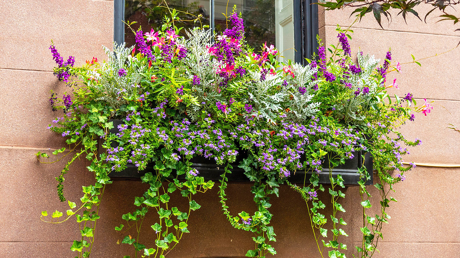 Questa splendida fioriera è ricca di colori vivaci grazie all’angelonia viola, alla scaevola e ai fiori rosa della mandevilla.
