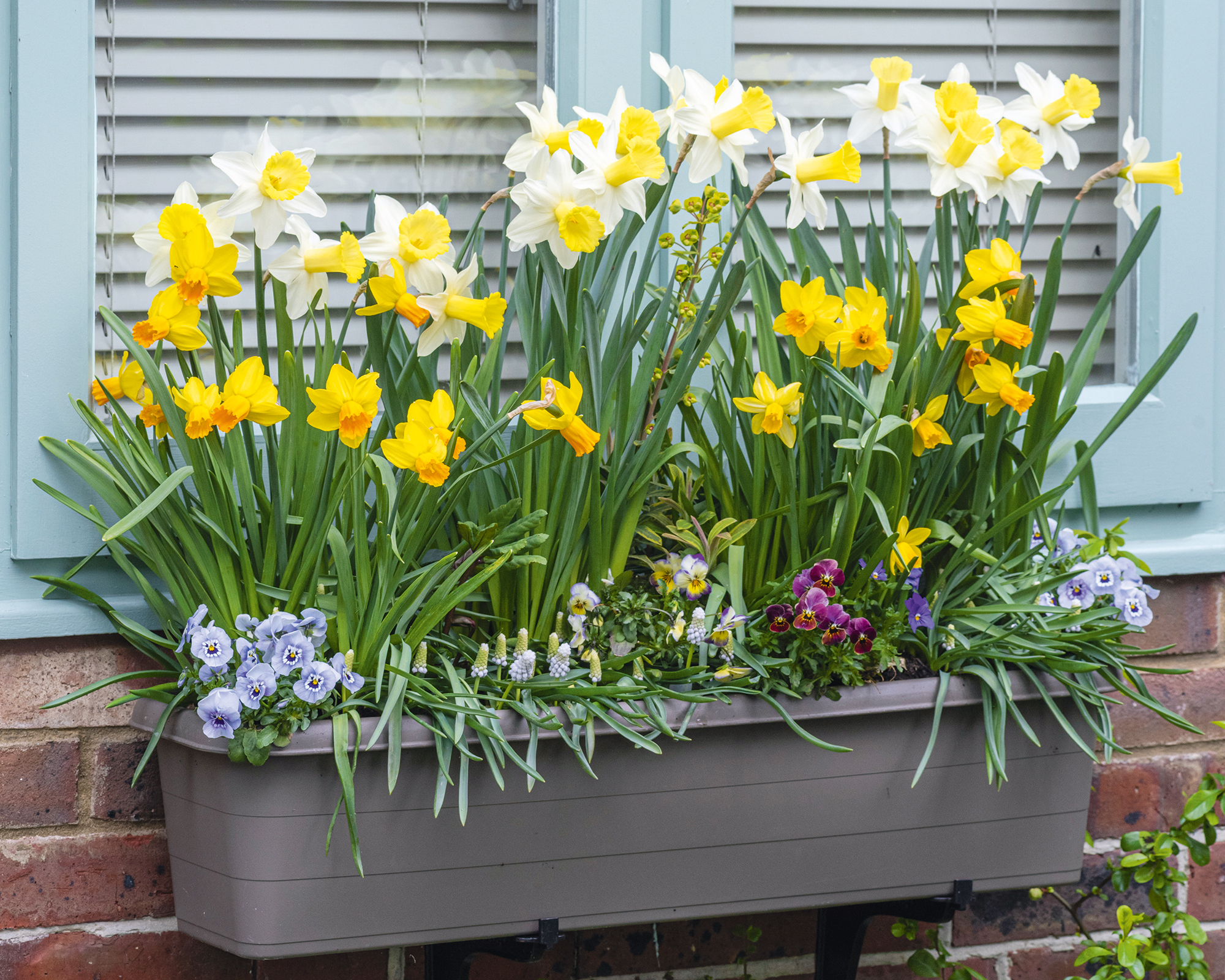 Qui, i narcisi Narcissus ‘Jetfire’, Narcissus ‘Smiling Sun’ e Muscari ‘Siberian Tiger’ sono intervallati da viole e euforbie che fioriscono in inverno.