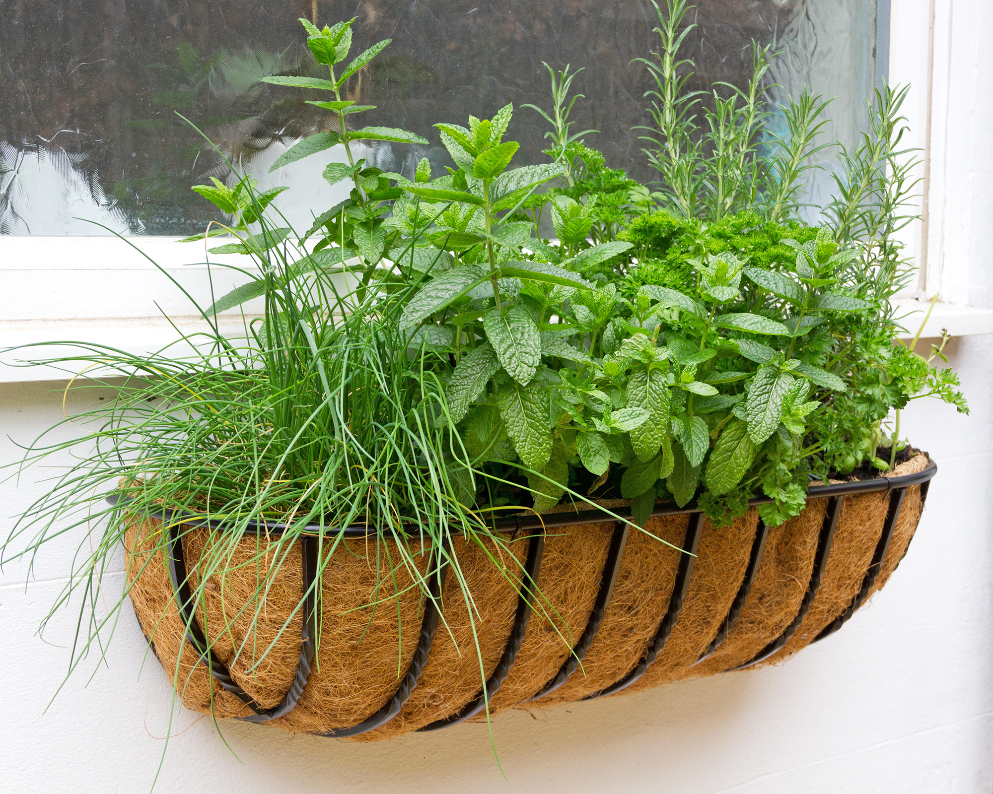 Le erbe aromatiche adatte alla coltivazione in fioriere da finestra includono basilico, erba cipollina, coriandolo, menta, origano, prezzemolo, rosmarino, salvia, dragoncello e timo.