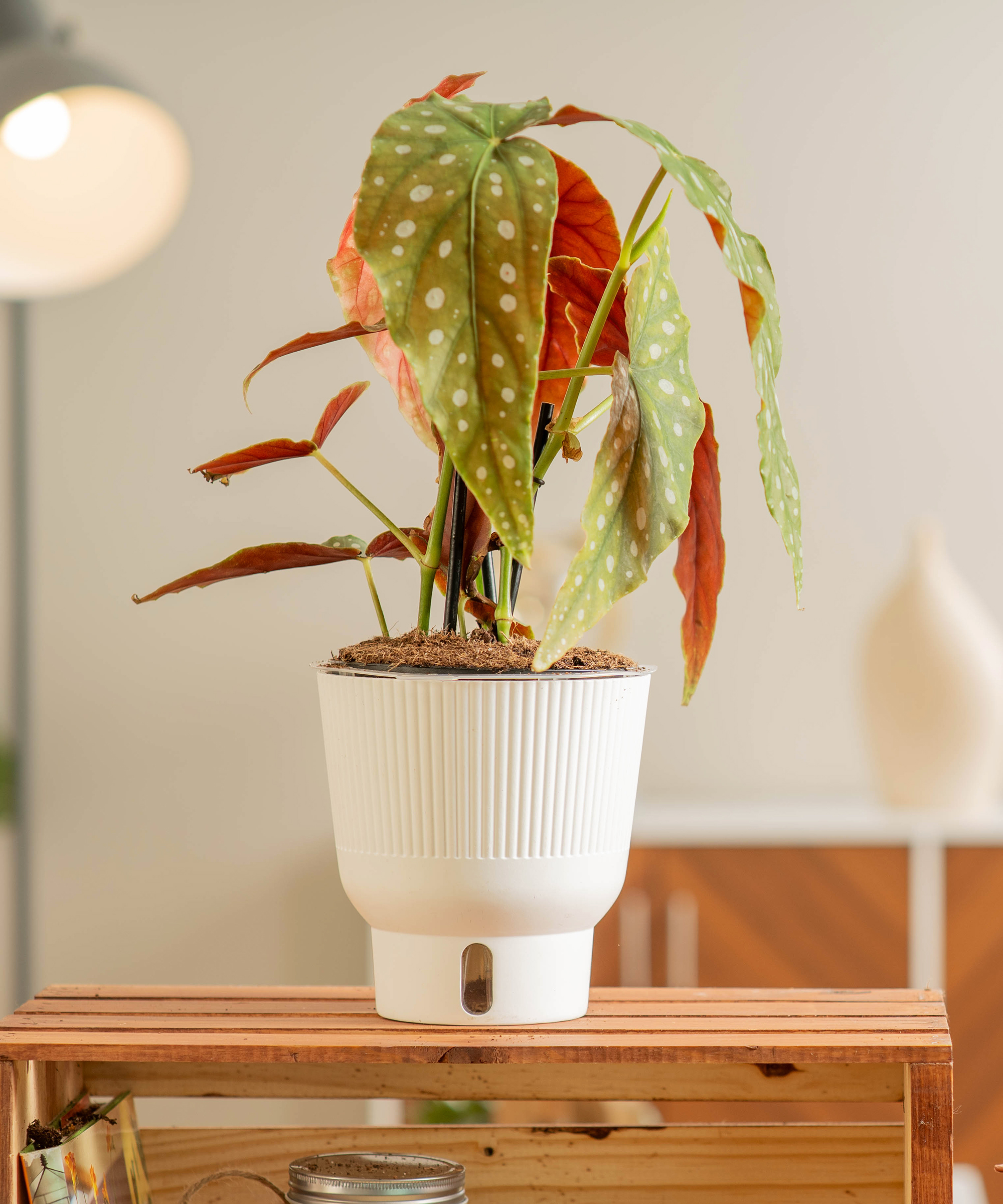 Una luce indiretta e brillante all’interno previene la crescita eccessiva. Le zone con scarsa illuminazione riducono la fioritura, ma il fogliame rimane comunque brillante. Innaffiate le begonie in modo uniforme, lasciando asciugare leggermente i primi 2,5 cm di terreno tra un’annaffiatura e l’altra per imitare i ritmi naturali. Le stanze arieggiate sono l’ideale per queste begonie e un’umidità più elevata aumenta le dimensioni e la lucentezza delle foglie.