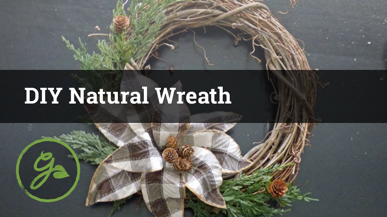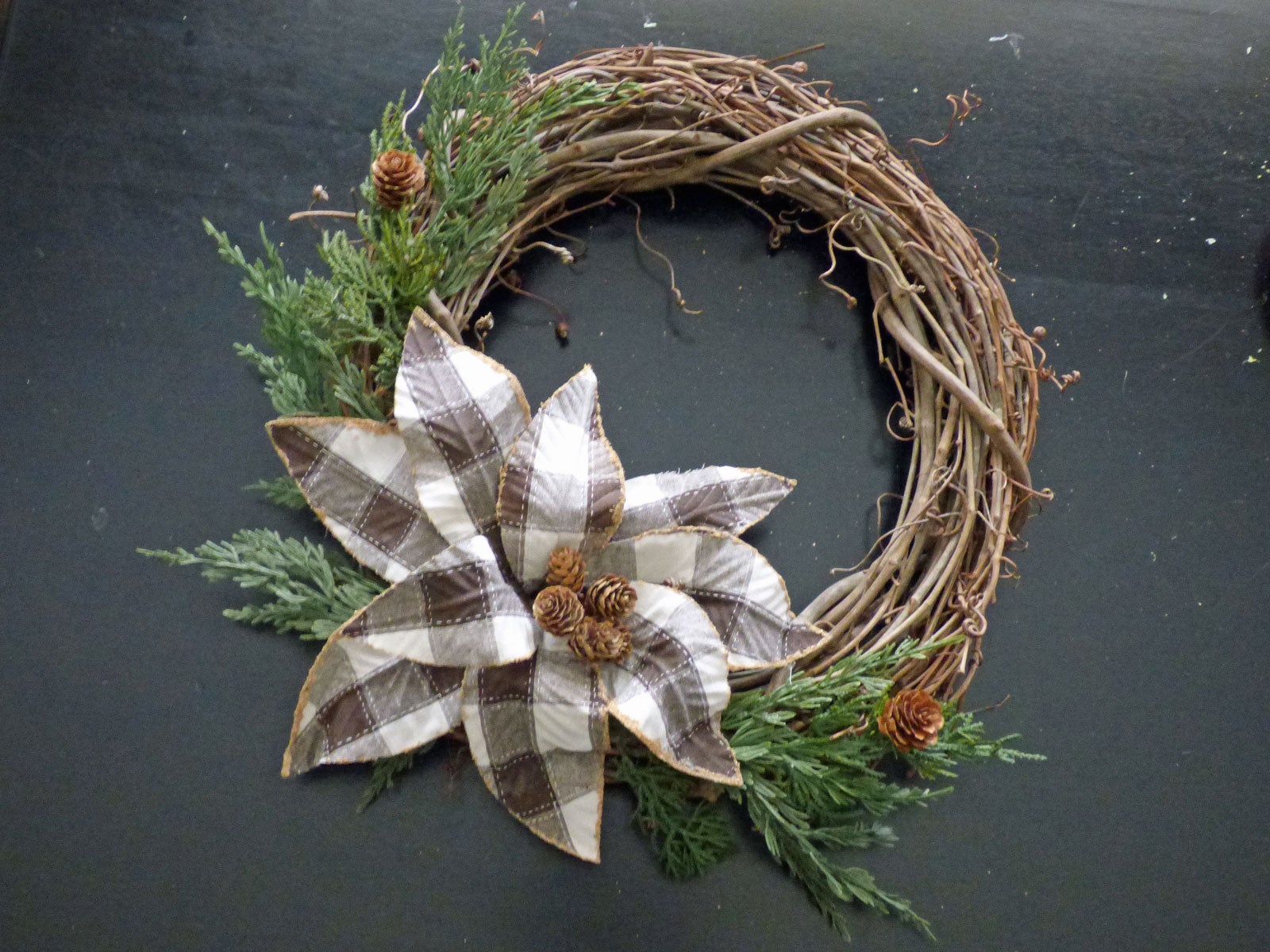 Mi piace mantenere le cose semplici e un po’ diverse, quindi per questo progetto sto usando una poinsettia a scacchi marroni e bianchi e rami di ginepro e abete con piccoli coni marroni attaccati. Sentitevi liberi di usare qualsiasi tipo di poinsettia e fogliame vi piaccia. Normalmente proteggerei anche il mio spazio di lavoro con del cartone, ma oggi ho saltato questo passaggio.