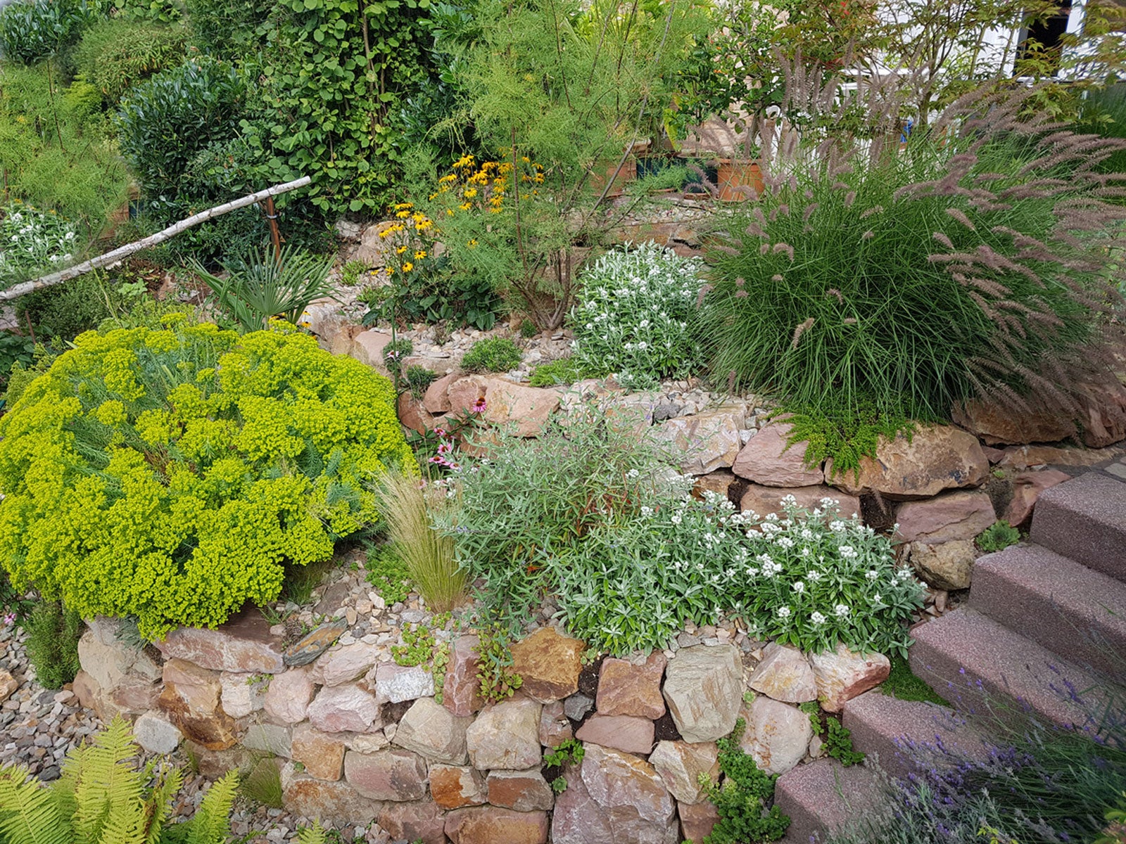 Progettare un giardino su un pendio è una sfida ingegneristica. L’acqua e il terreno scivolano via, le piante sono soggette alla forza di gravità e gran parte delle sostanze nutritive del terreno e dei fertilizzanti finiscono semplicemente per scivolare giù. Tuttavia, se si costruisce un giardino roccioso su un pendio, le rocce diventano una barriera che rallenta o addirittura blocca gran parte di queste perdite.