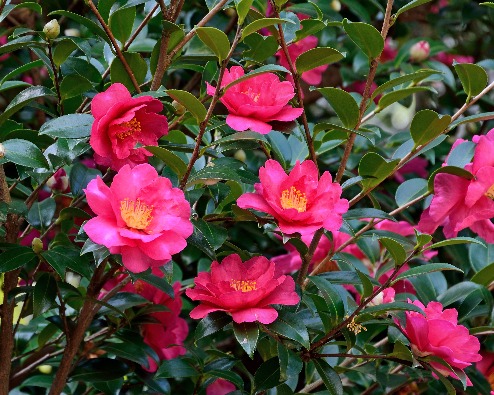 Le camelie (Camellia sasanqua) sbocciano con grandi fiori simili a rose in inverno o in primavera, di colore rosa, rosso o bianco, che risaltano sulle foglie lucide che brillano tutto l’anno. Le loro forme si adattano alle fondamenta o agli accenti senza risultare eccessive.