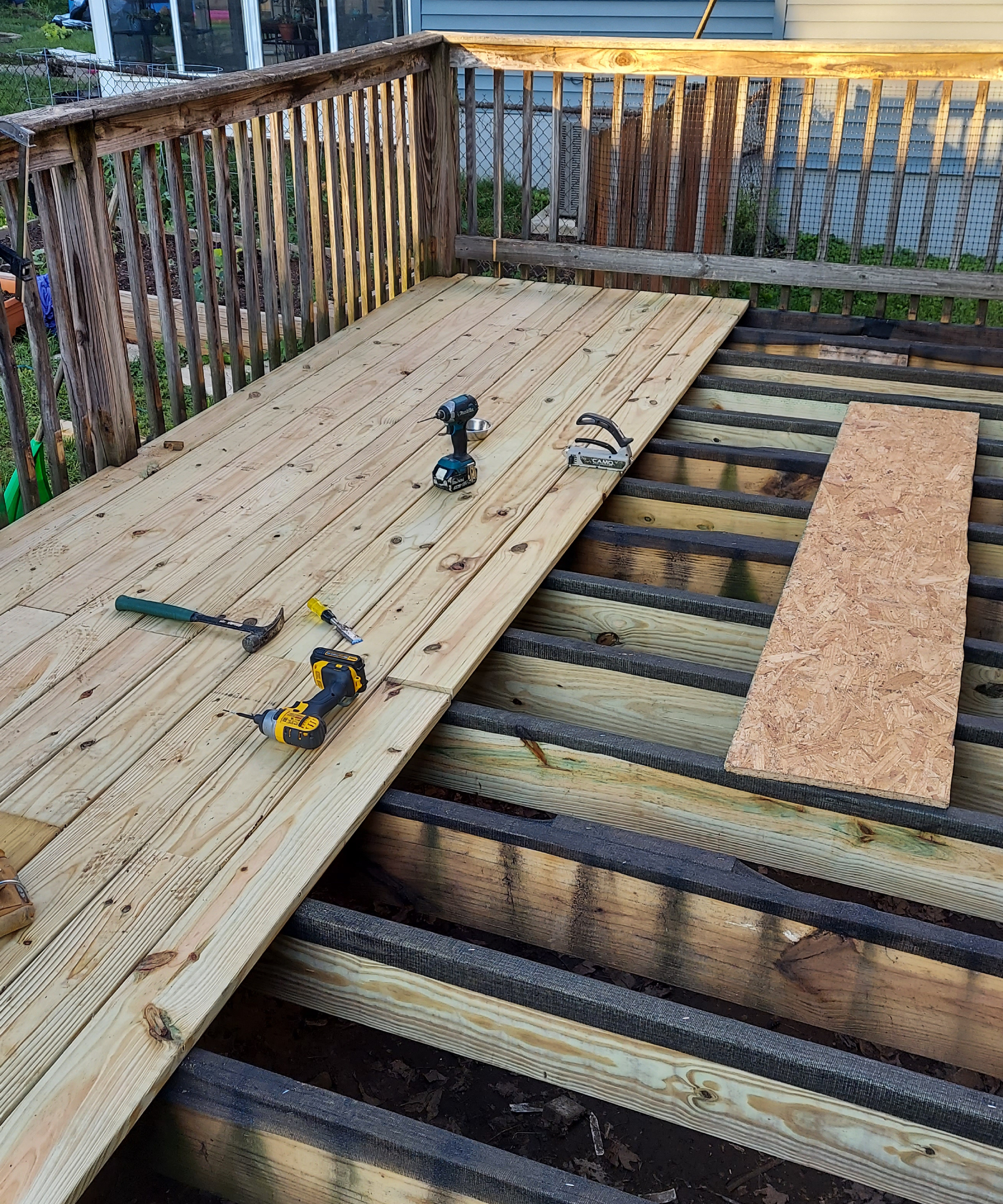 I primi passi per ricostruire la terrazza sono stati strappare la vecchia superficie, sostituire i travetti marci e raddoppiare il numero dei travetti. (Sono riuscito a riciclare il vecchio legname per costruire un’aiuola rialzata!) Il vecchio terrazzo era stato costruito in modo errato e i travetti erano troppo distanziati tra loro per fornire un sostegno adeguato allo spessore del legname utilizzato per la pavimentazione.