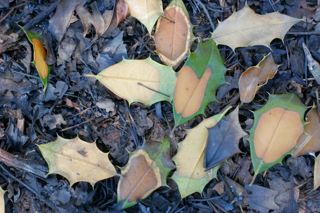 La caduta primaverile delle foglie nell’agrifoglio può segnalare un problema se non segue il normale schema descritto sopra. Anche l’ingiallimento e la perdita delle foglie in altri periodi dell’anno dovrebbero far sospettare che qualcosa non va. Di seguito sono elencate le possibili cause: Problemi di irrigazione: la mancanza d’acqua, l’eccesso d’acqua o uno scarso drenaggio possono causare l’ingiallimento e la caduta delle foglie. Questo può accadere in qualsiasi periodo dell’anno. Malattie: La macchia fogliare dell’agrifoglio causata da Coniothyrium ilicinum, Phacidium species o altri funghi può provocare la comparsa di macchie giallo-marroni o nere sulle foglie e, in caso di infestazioni gravi, può causare la caduta delle foglie in primavera. Questi funghi attaccano principalmente le foglie più vecchie. Tuttavia, le macchie di forma rotonda o irregolare appariranno diverse dall’ingiallimento che si verifica durante la normale caduta delle foglie, che di solito colpisce l’intera foglia. È importante riconoscere la differenza in modo da poter adottare misure per controllare la malattia, come pulire le foglie cadute che presentano segni di infezione per prevenire la diffusione della malattia. Clima invernale: I danni causati dal clima invernale compaiono spesso su un lato o su una parte della pianta e le foglie esterne (vicine alle punte dei rami) possono essere le più colpite, il contrario di ciò che si osserva con la normale caduta delle foglie primaverile nell’agrifoglio. Anche se il danno si verifica in inverno, l’imbrunimento potrebbe non comparire sugli agrifogli fino alla primavera.